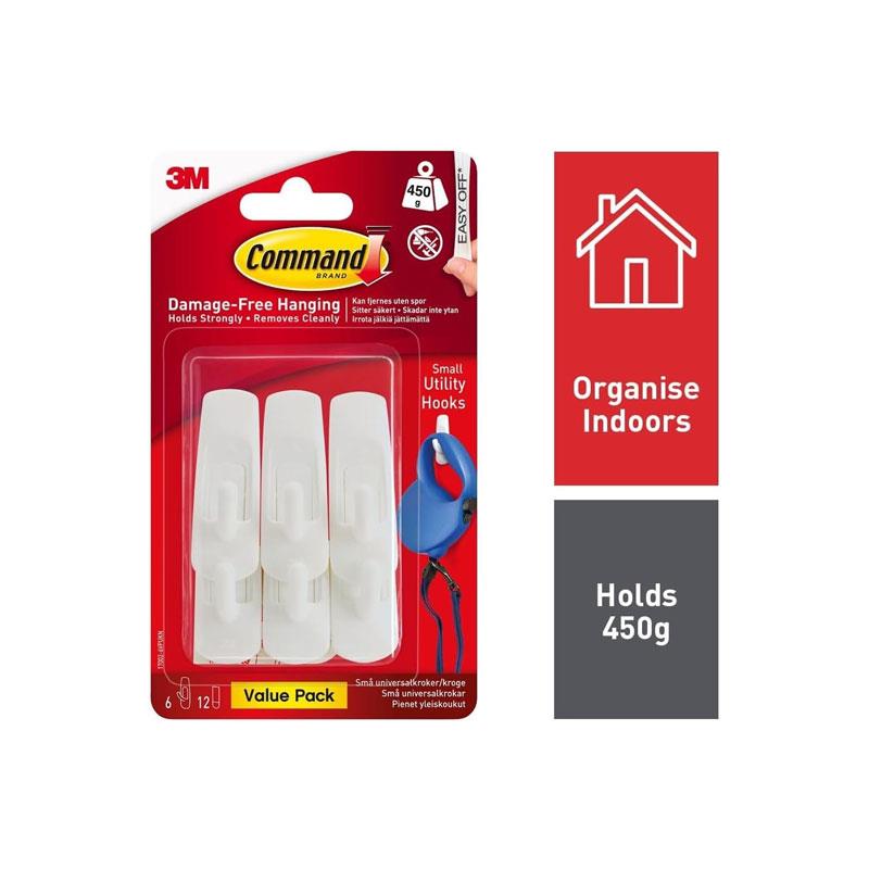 3M Command Utility Hooks Small 6 Hooks And 12 Small Strips 450g Holding Power Value Pack White