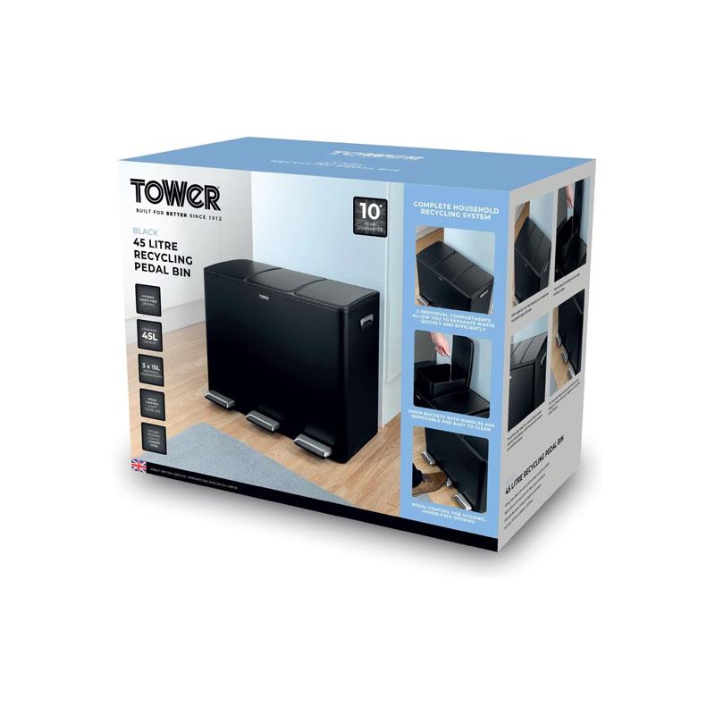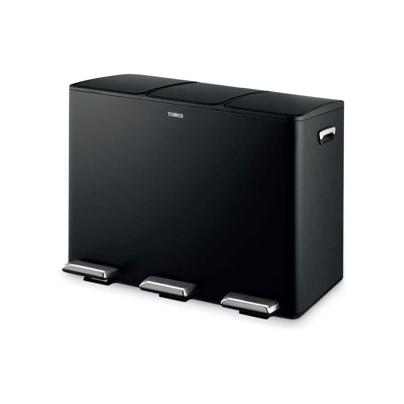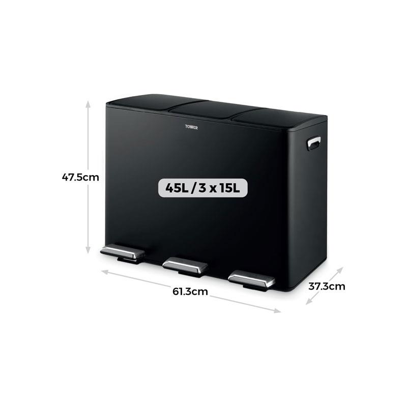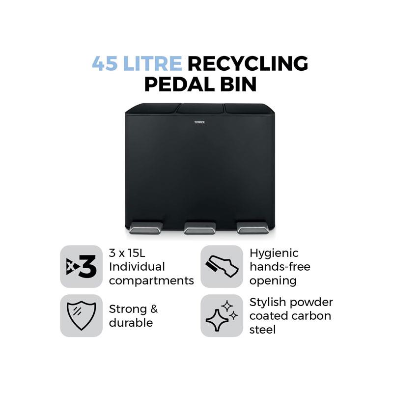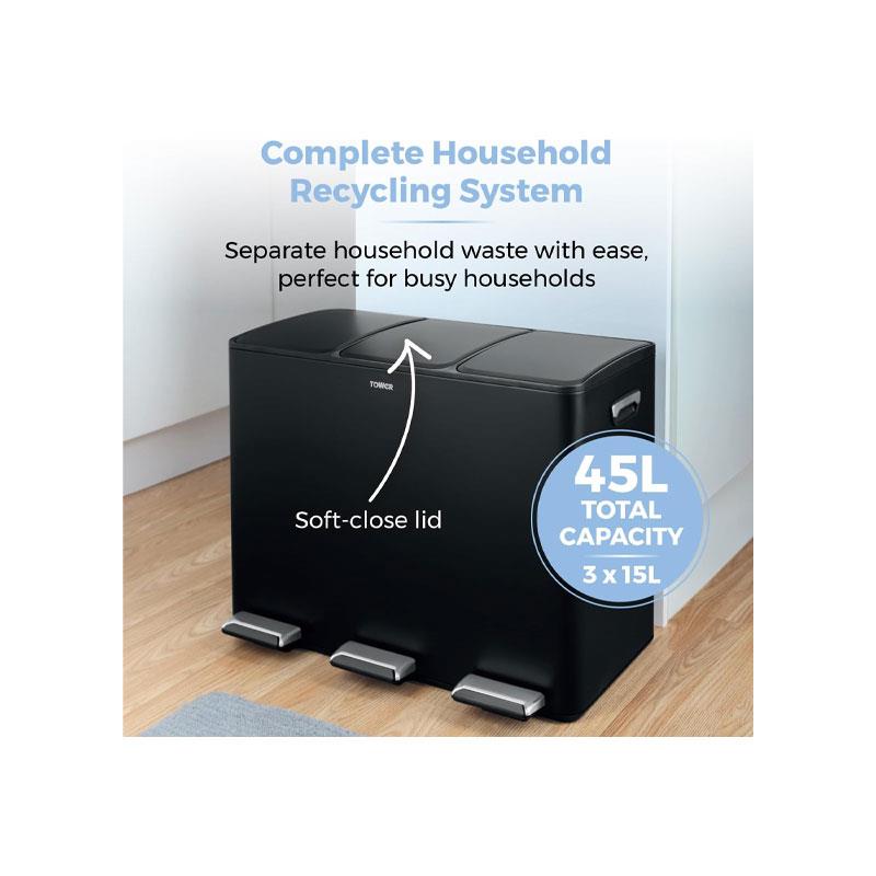 Tower Recycling Pedal Bin 45 Litre 3 Individual 15L Compartments Carbon Steel Body Three Inner Buckets Black