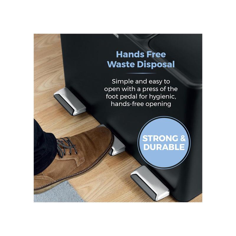 The bin features three separate 15L removable compartments, allowing you to easily organise household waste such as plastics, glass, paper, and general rubbish. Each section includes its own independent foot pedal, providing a hygienic, hands-free experience for effortless waste disposal.