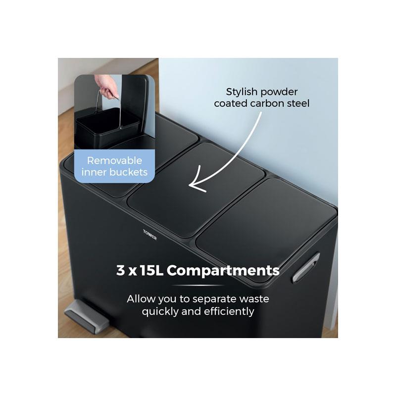 Tower Recycling Pedal Bin 45 Litre 3 Individual 15L Compartments Carbon Steel Body Three Inner Buckets Black - Image 7