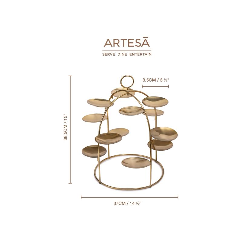 The Artesà Luxury Serving Stand is the perfect addition to any dining or entertaining occasion. Ideal for serving canapés, desserts, nibbles, or afternoon tea treats, this stand brings creative flair and elegance to your tablescape. The warm brass tone adds an opulent touch, making it a statement piece that will impress guests at any event.