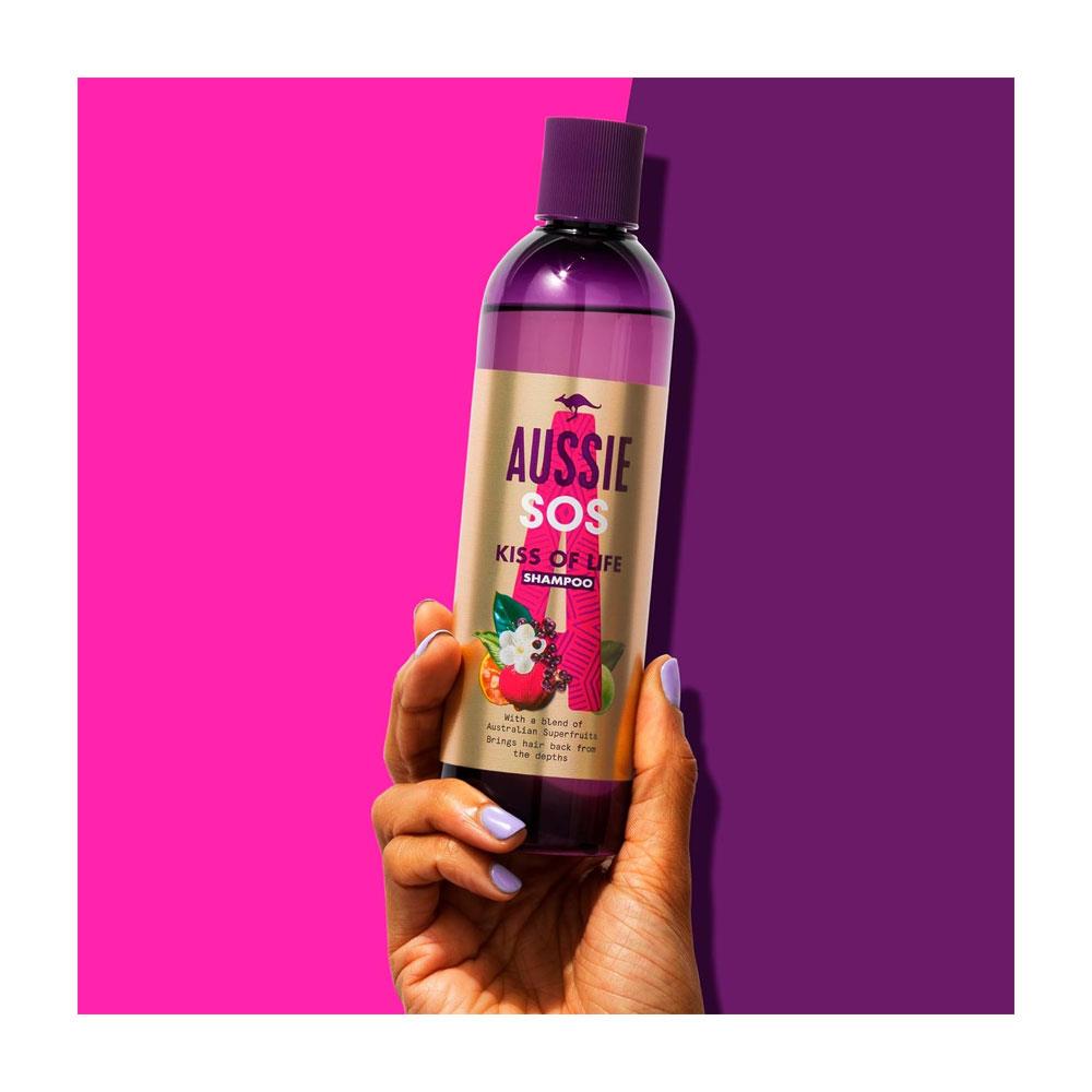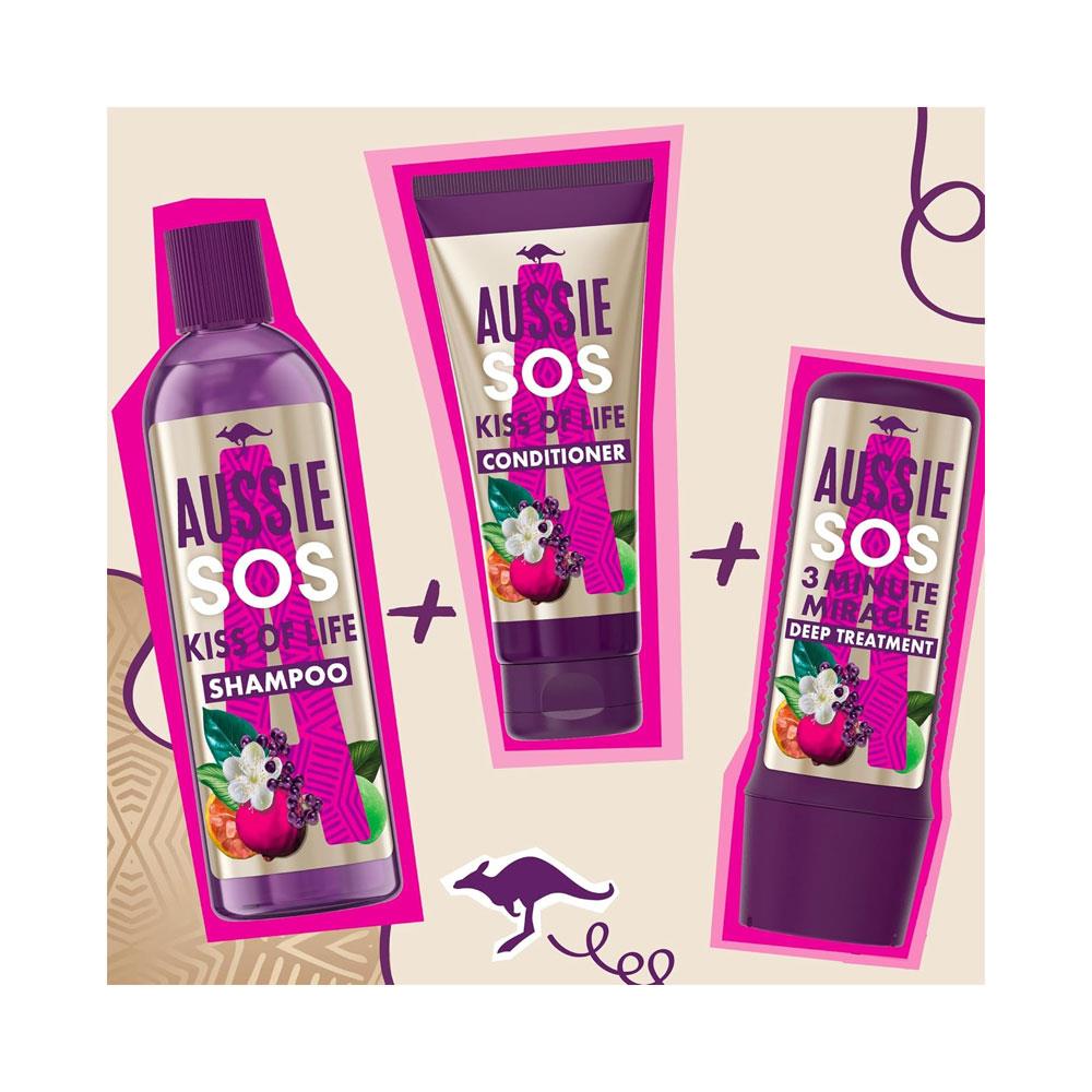 Massage into wet hair until it lathers, breathe in that luscious fruity scent, then rinse thoroughly. For best results, follow with Aussie SOS Kiss Of Life Conditioner and finish with the 3 Minute Miracle Treatment for maximum revival