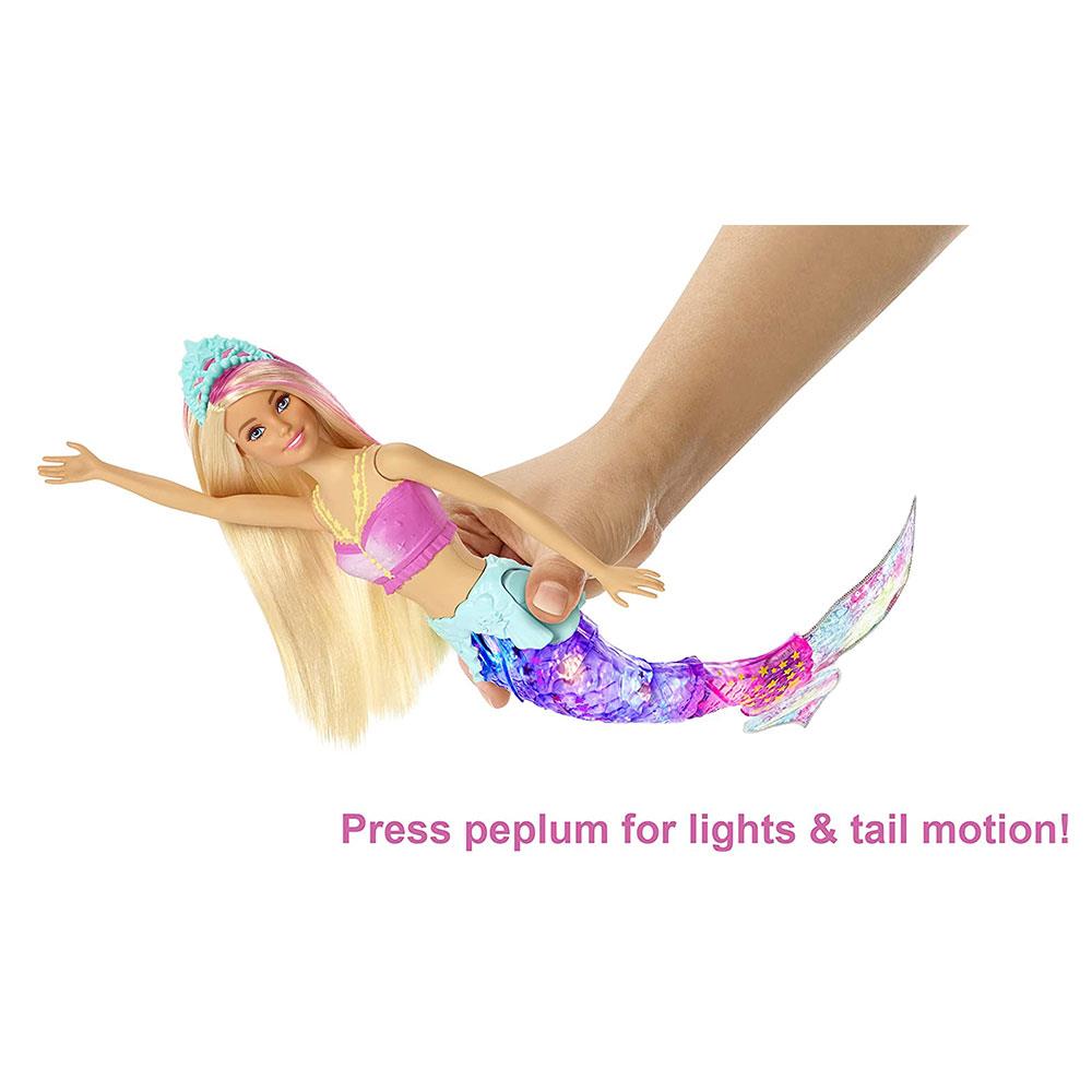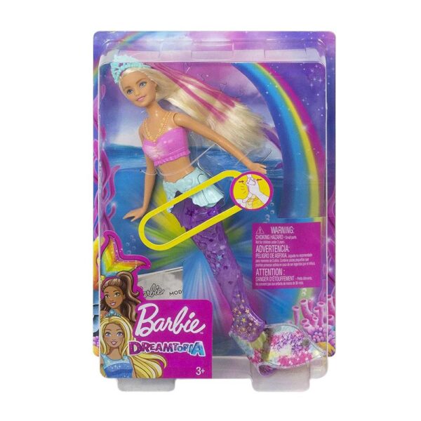 Magical Light-Up Action With a simple dip into water, Barbie’s pearlescent purple tail lights up in one of four dazzling rainbow light shows, adding a magical touch to your playtime. Press the button on her bodice to activate the light show even on land, allowing for endless imaginative storytelling.