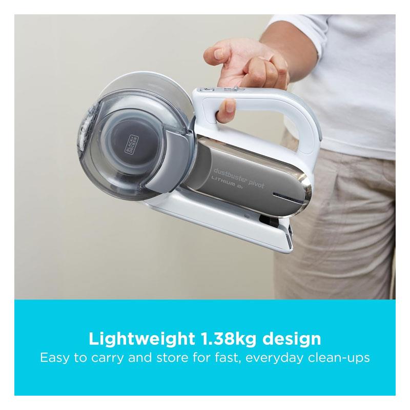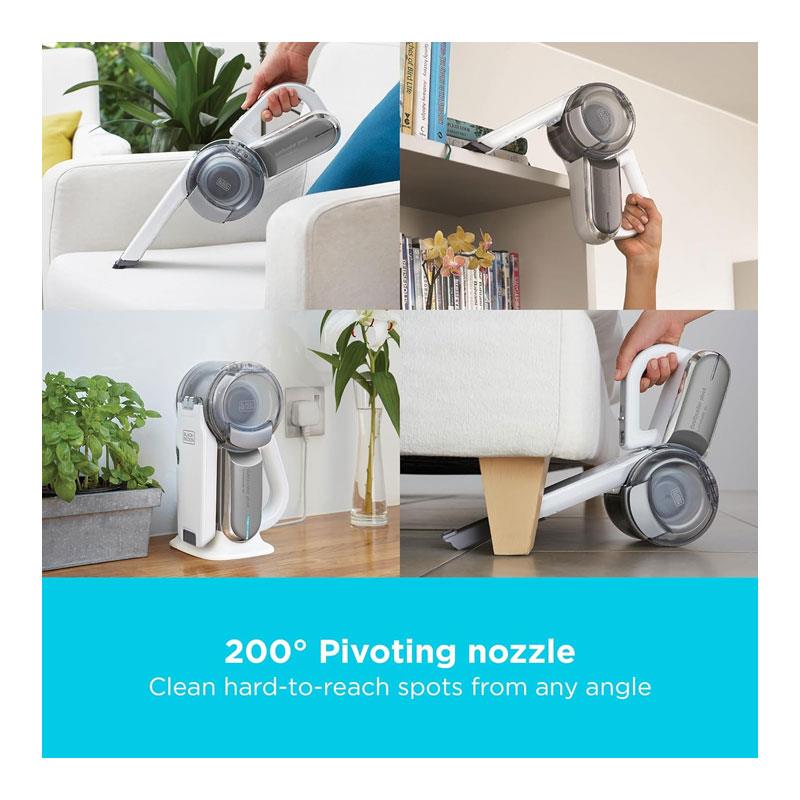 Take cleaning to the next level with the Black+Decker 18V Cordless Pivot Handheld Vacuum Cleaner – the ultimate combination of power, convenience, and versatility. Featuring a patented 200° pivoting nozzle, strong cyclonic suction, and a lightweight compact design, this cordless dustbuster tackles messes high, low, and everywhere in between. Perfect for quick clean-ups, car interiors, stairs, and tight spaces, it’s your go-to tool for powerful everyday cleaning.