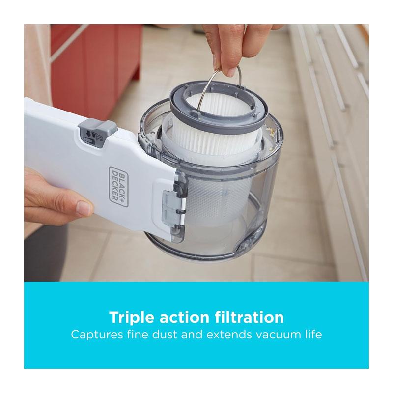 • Cyclonic Action + Triple Filtration – Keeps dust away from the filter for lasting suction