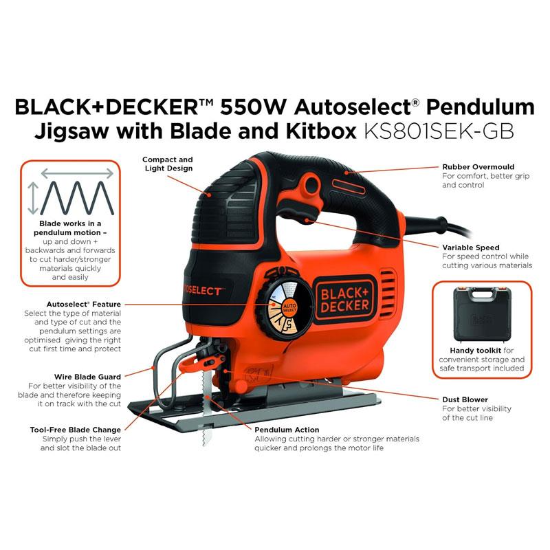Black & Decker Autoselect Pendulum Jigsaw With Blade And Kit Box 550W 230V – Black/Orange