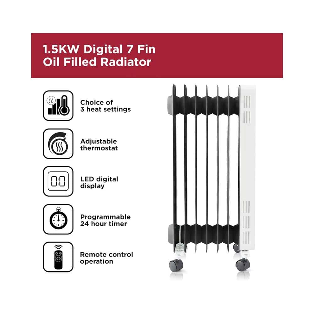 Black & Decker Digital Oil Filled Radiator 1500W 3 Heat Settings Adjustable Thermostat 24hr Timer – White