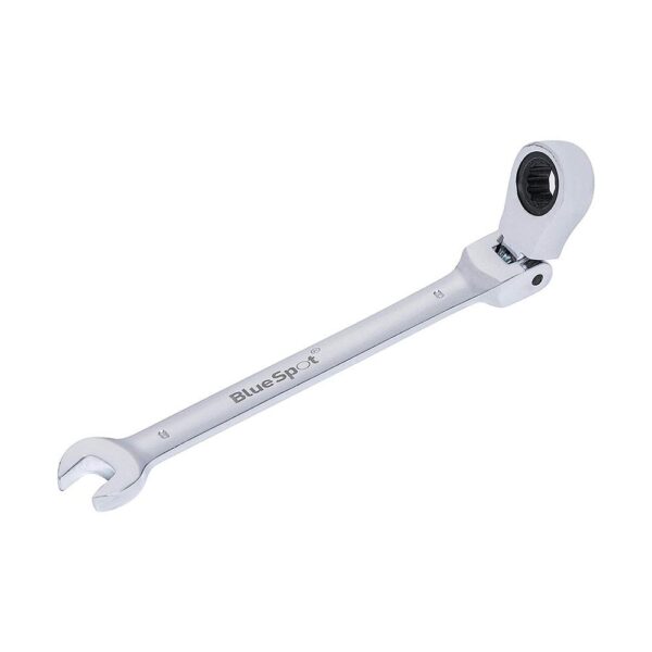 Blue Spot Tools Flexible Ratchet Spanners feature 180° pivoting ratchet ring heads. Manufactured from chrome vanadium, heat-treated and nickel-plated for increased durability. 5° ratcheting increments make set ideal for use in tight spaces. Fully polished mirror finish.