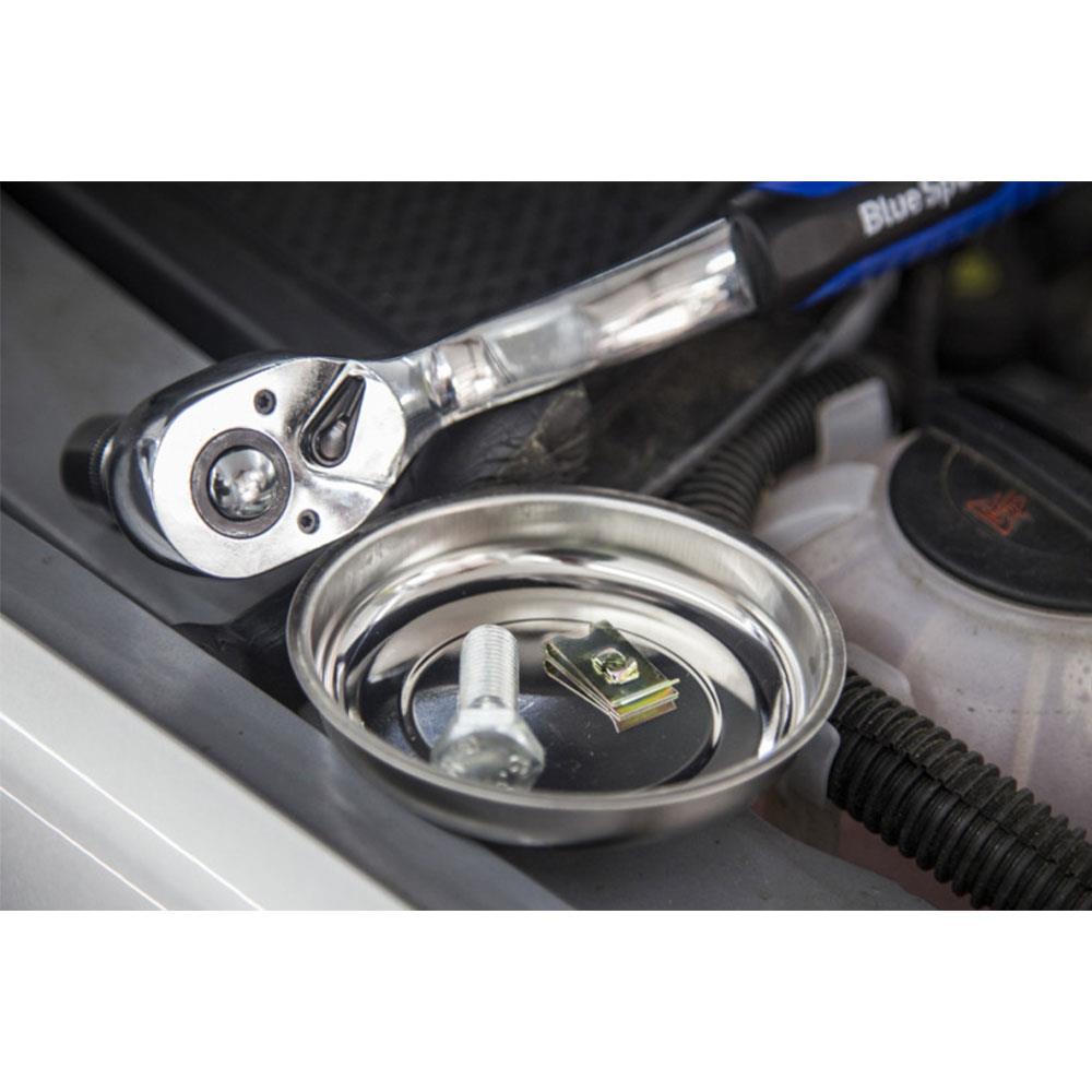 The BlueSpot 100mm (4”) Stainless Steel Magnetic Dish is a useful tool for keeping parts safe when working. The magnetized dish can be used on its side as well as upside down. The base is rubberized so you can use it on body panels without causing damage.