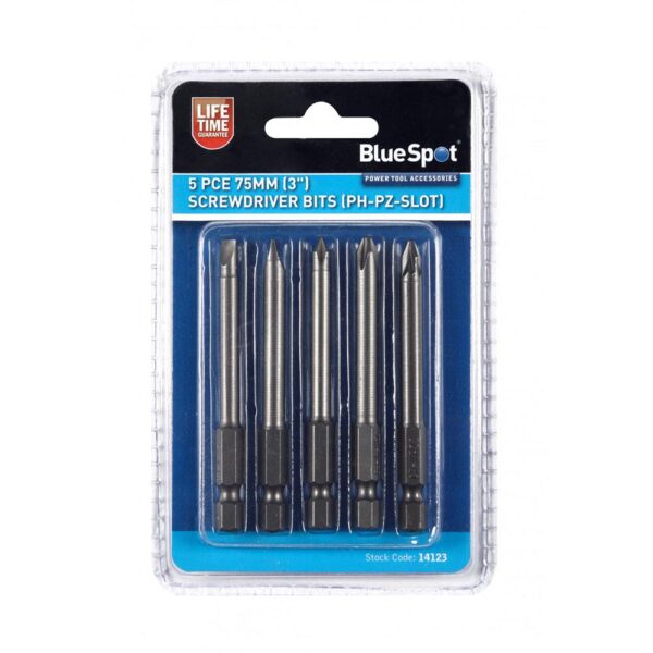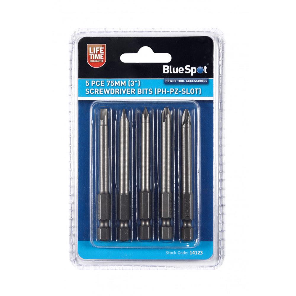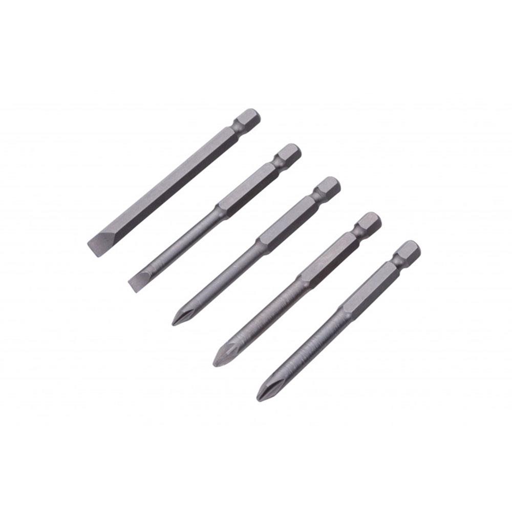 BlueSpot Screwdriver Bits 5 Piece Set 75mm Long PH1 PH2 PZ2 Slotted 5mm 6mm – Silver