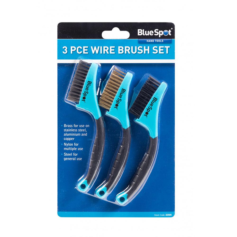 BlueSpot 3 PCE Wire Brush Set features an ergonomic grip for user comfort. The wire brushes are very suited for use around the workplace, at home, or on hobby projects. The set contains 3 brushes (brass, nylon, and steel).