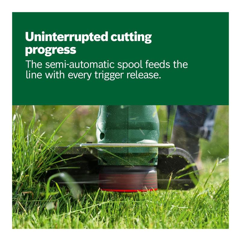 • Continuous Cutting – Semi-automatic spool feeds the line with every trigger release for uninterrupted trimming.