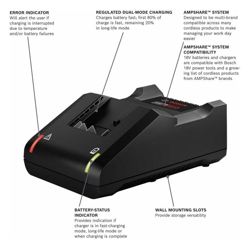 • Rapid Charging Performance – Fully charges a Bosch CORE18V 4.0Ah battery in just 65 minutes.