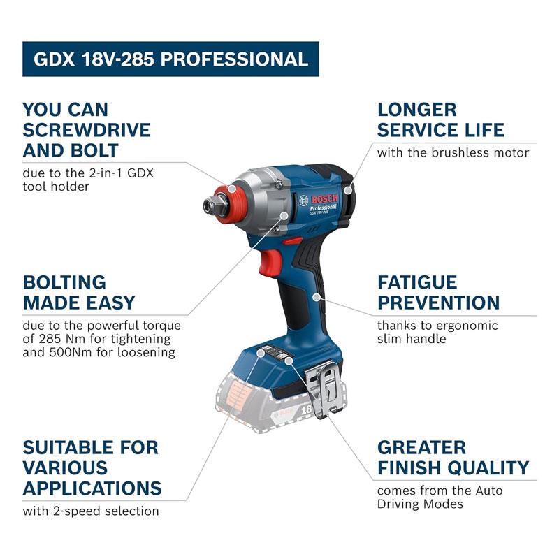 Whether you’re tightening heavy-duty bolts or driving long screws, the GDX 18V-285 delivers the reliability, control, and performance that Bosch is known for.