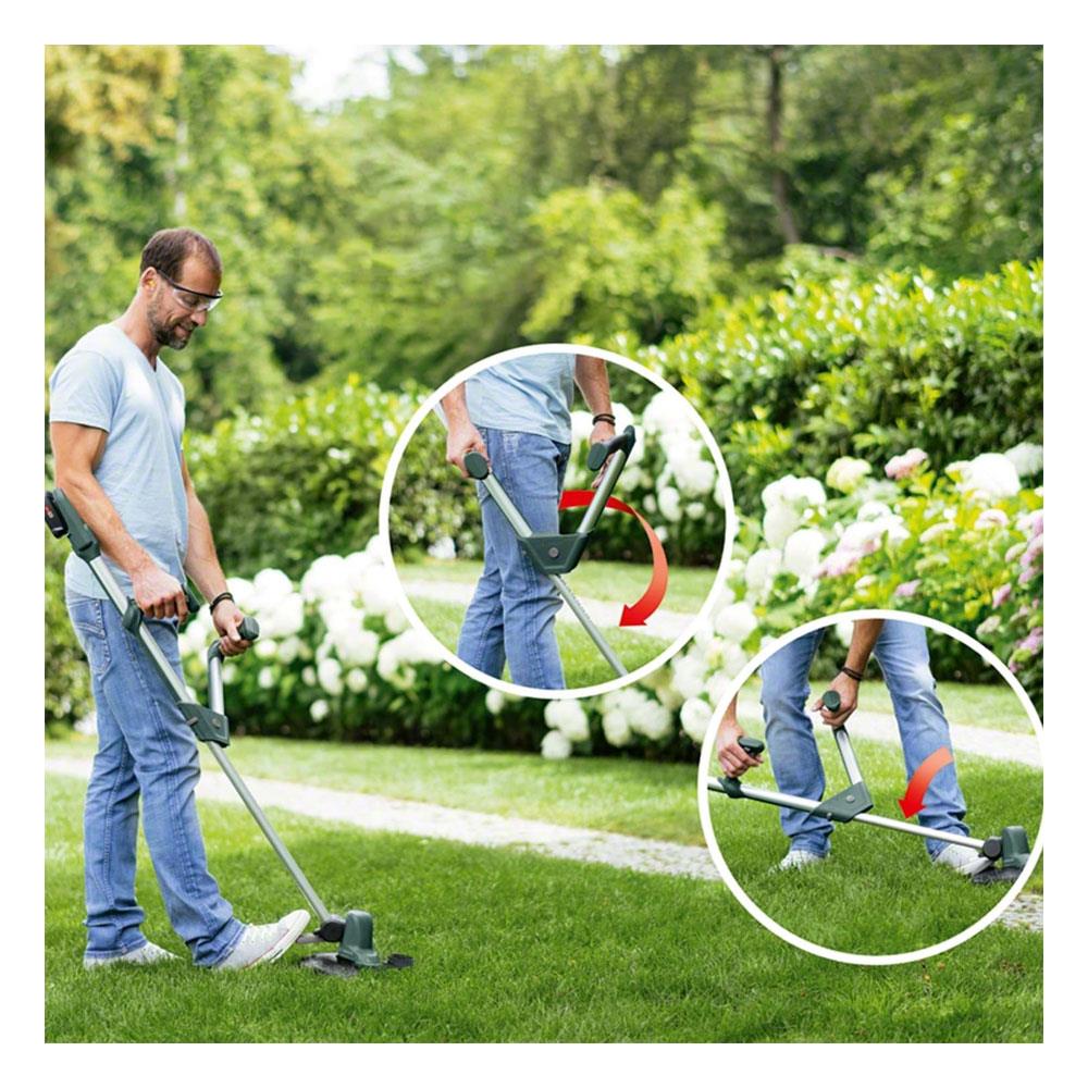 • Quick-Adjust Edging & Tilting: Simply press the foot pedal to tilt the trimmer head or switch to edge mode for precise trimming along paths, flowerbeds, or under garden furniture.