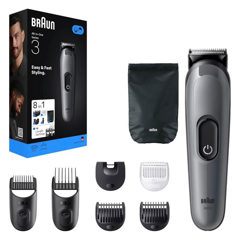 Braun All-in-One 3 Beard Trimmer & Hair Clipper for Men – 8-in-1 Grooming Kit, 14 Length Settings, Wireless 50-Minute Run Time | Buy Online UK