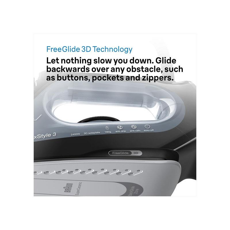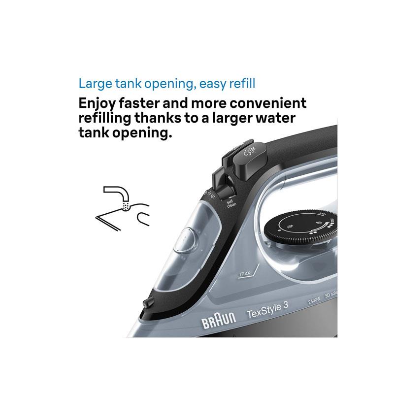 Braun TexStyle 3 Steam Iron 2400W With Super Ceramic Soleplate FreeGlide 3D Technology & 270ml Water Tank Black - Image 3