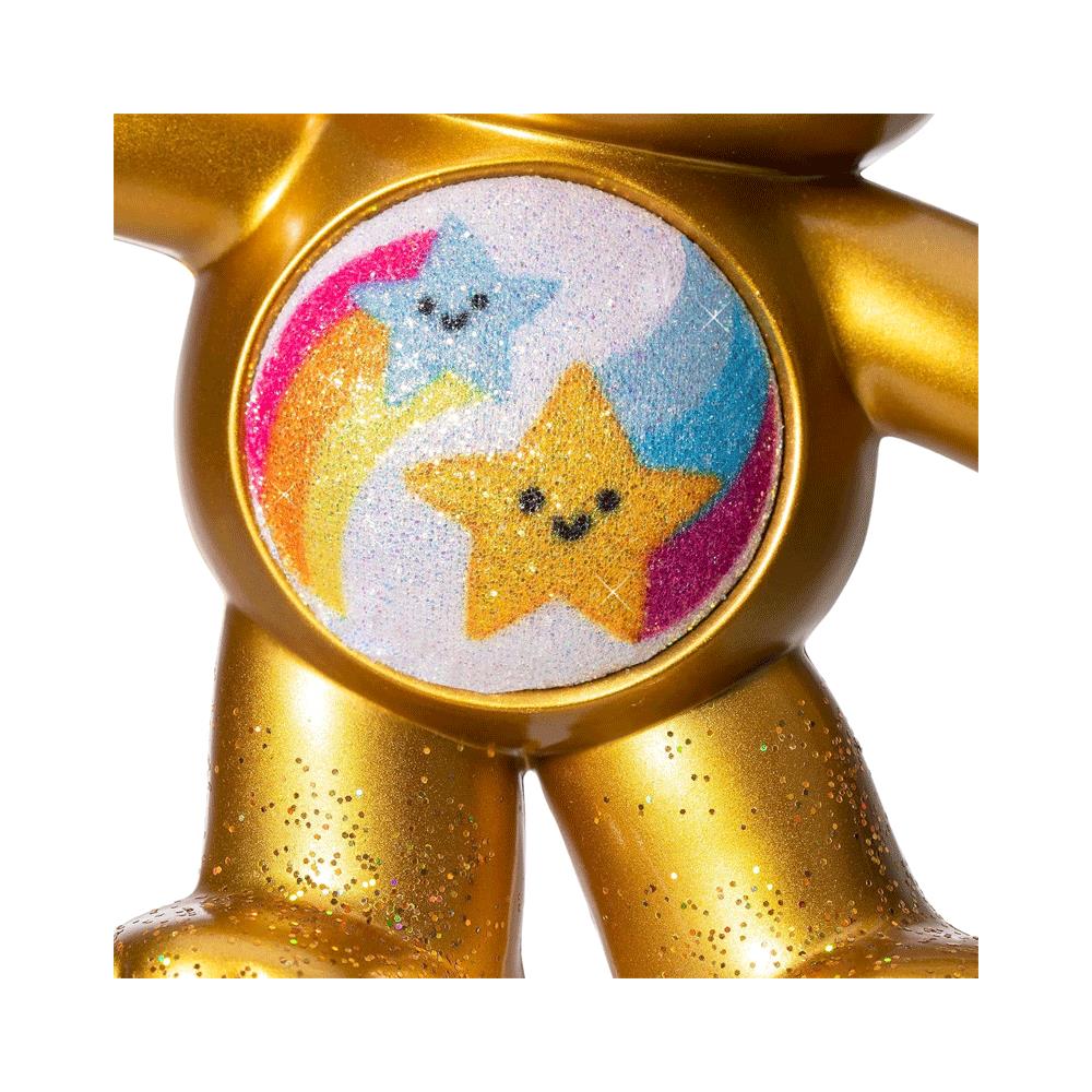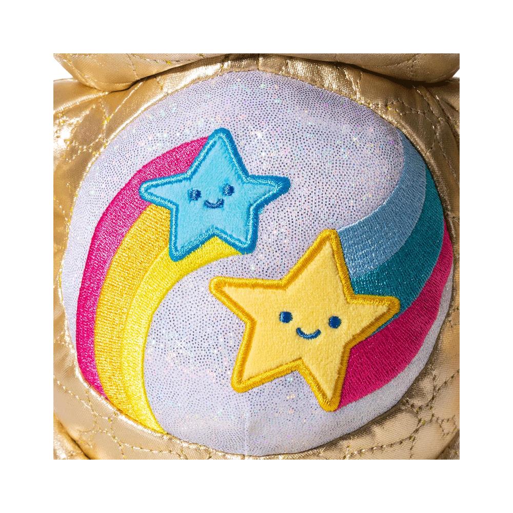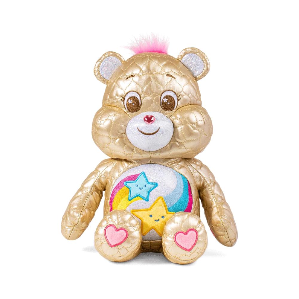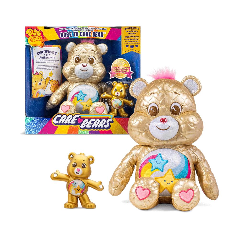 Featured in a beautiful golden quilted fabric, Care Bears fans and collectors will love her luxurious design, glittery silver belly badge, mouth, and ears, and her adorable heart-shaped pink nose. And as an added bonus, she also comes with a stunning, golden 4-inch Dare to Care Bear collectible figure. How bear-rific!