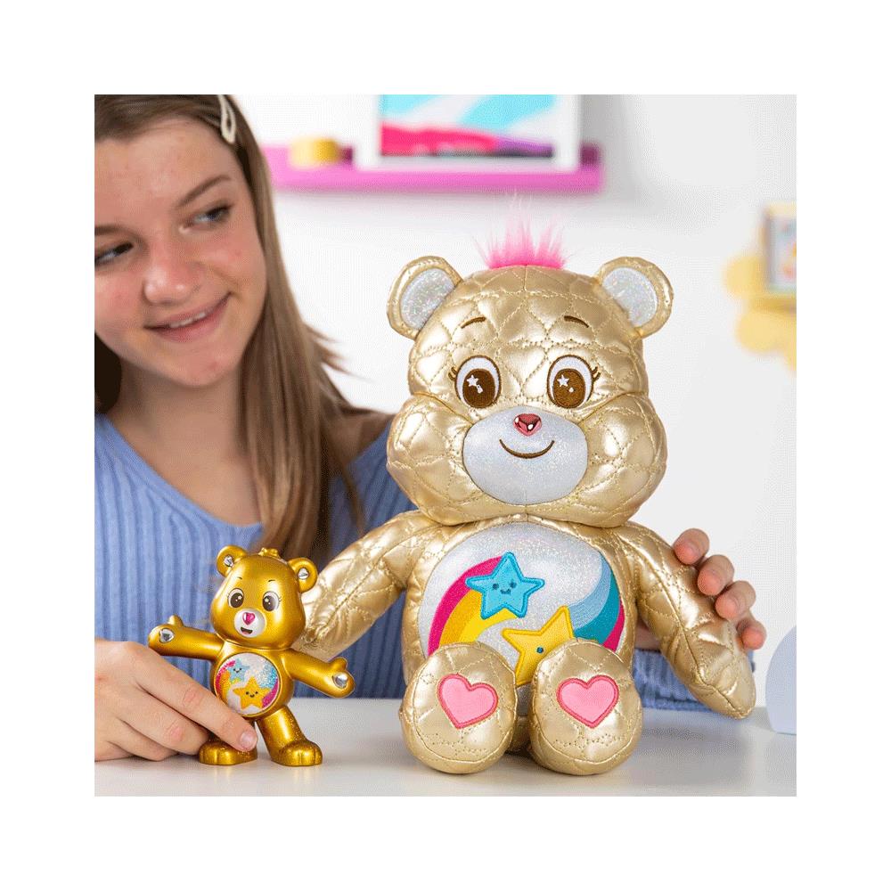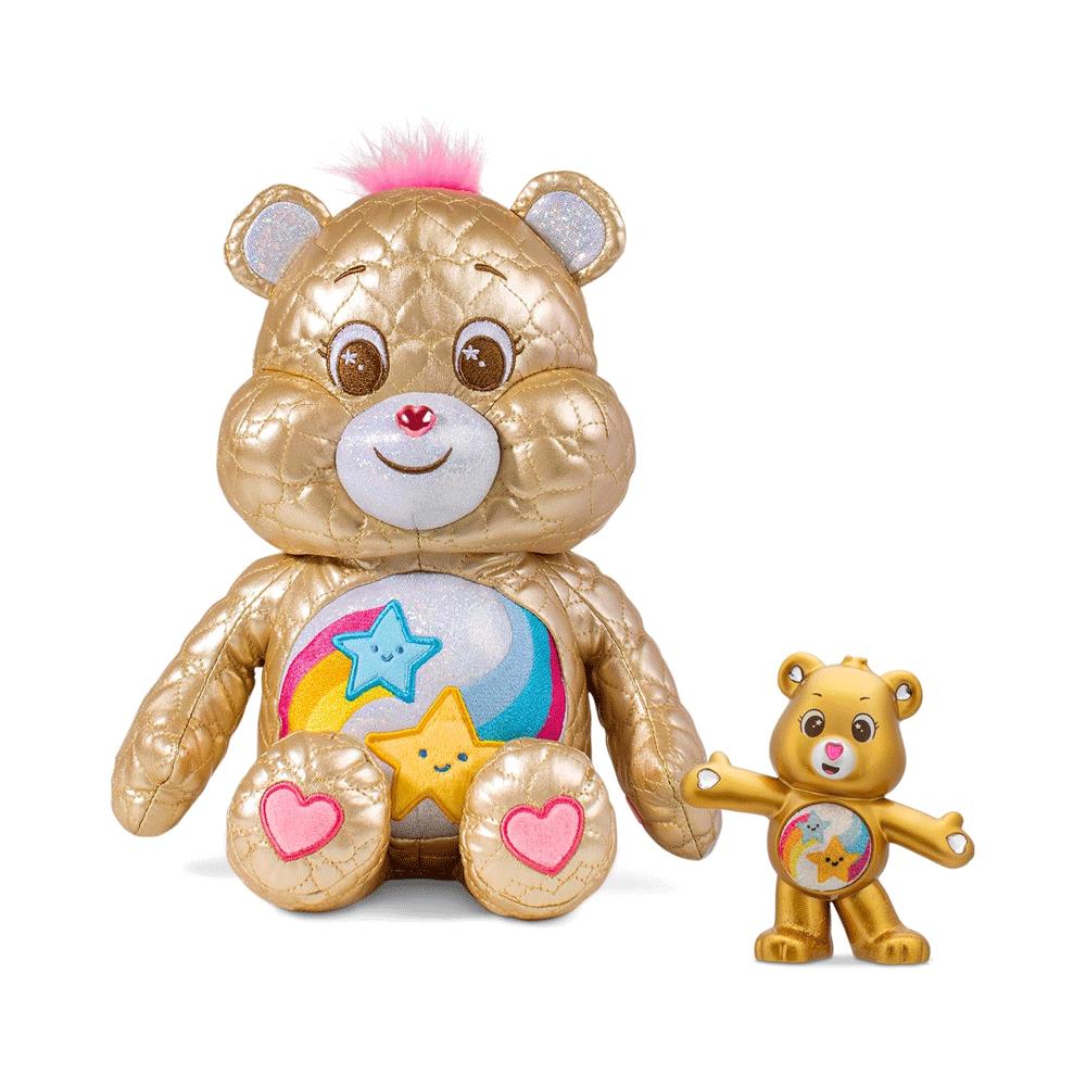 • LIMITED EDITION: Featured in a beautiful golden quilted fabric, Care Bears fans and collectors will love her luxurious design, glittery silver belly badge, mouth, and ears, and her adorable heart-shaped pink nose. And as an added bonus, she also comes with a stunning, golden 4-inch Dare to Care Bear collectible figure. How bear-rific!