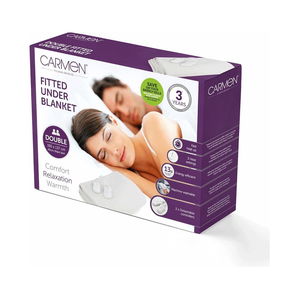 Enjoy extra warmth and cosiness all night long with the Carmen Double Fitted Electric Under Blanket made from 450gsm polyester soft to touch fabric. With a powerful 65W x 2 output and choice of 3 different heat settings, the blanket heats up to your perfect temperature in no time for a comfortable night’s sleep. Fits neatly edge to edge across your double mattress for complete body warmth. With 2x detachable controllers, you can adjust the temperature from either side of the bed. The blanket is efficiently designed to allow consistent warmth as you sleep, costing from as little as 27p per night to run* or 13p per night if only one controller is in use. For a quick and easy clean, simply detach the temperature controller and pop the blanket into the washing machine. The blanket automatically switches off to avoid overheating and provides added safety, so you can operate it safely during the day and night.