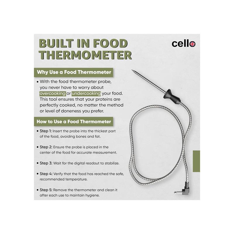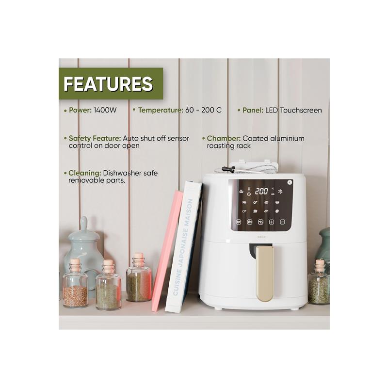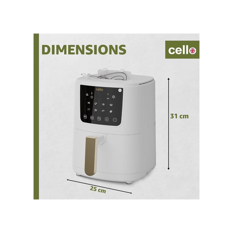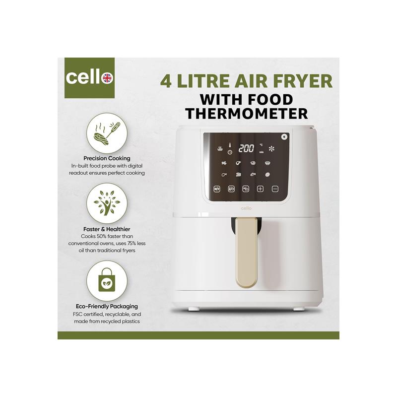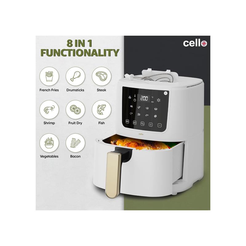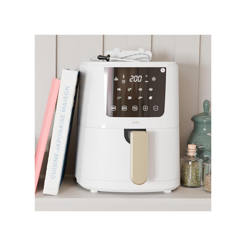Cello Single Basket Digital Air Fryer With In-Built ProChef Food Thermometer 8 Presets Grill Roast Bake Non-Stick Touch Control Recipes Included White