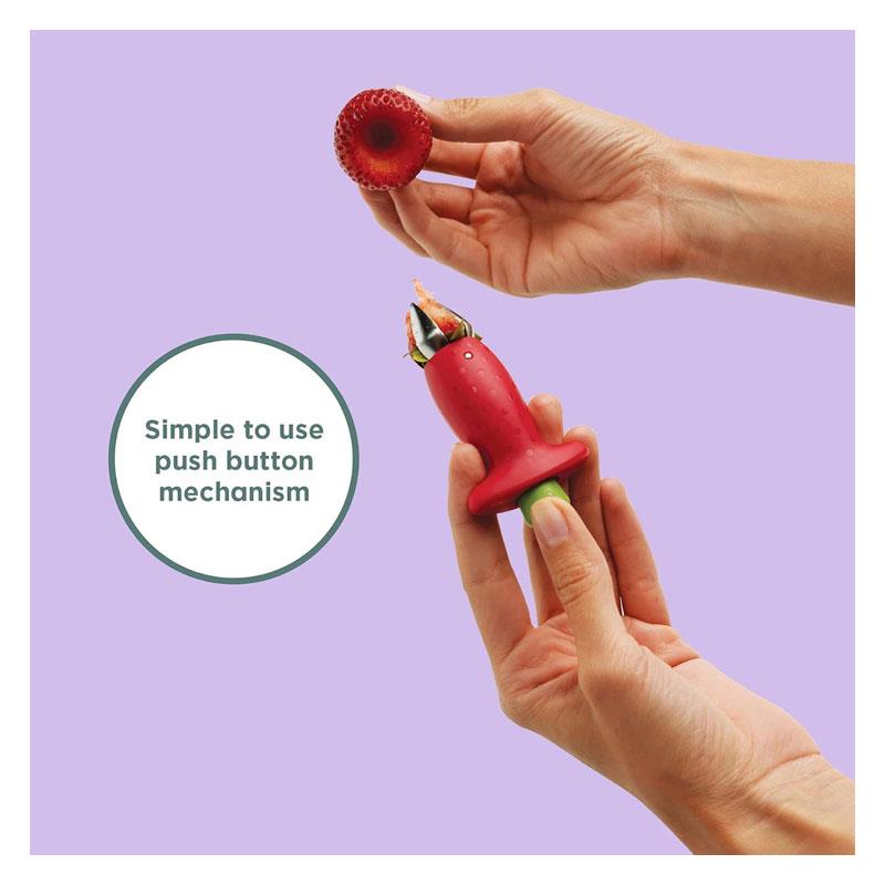 Simply press the button to open the blades, insert, release and twist—your strawberry hull pops straight out with zero fuss.