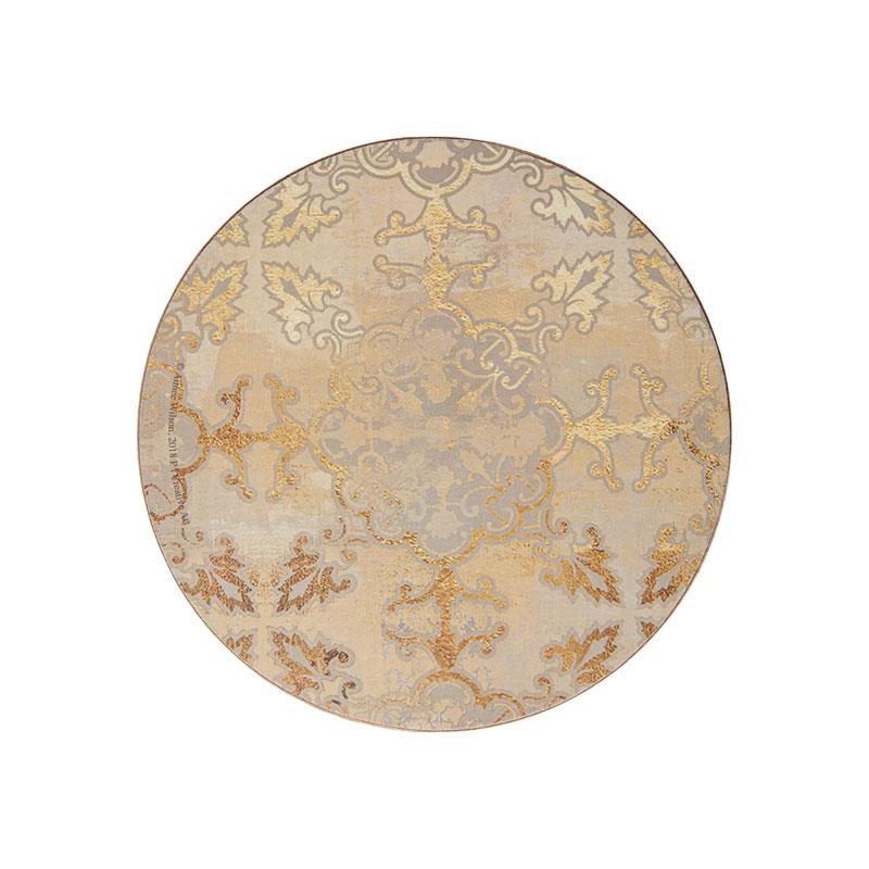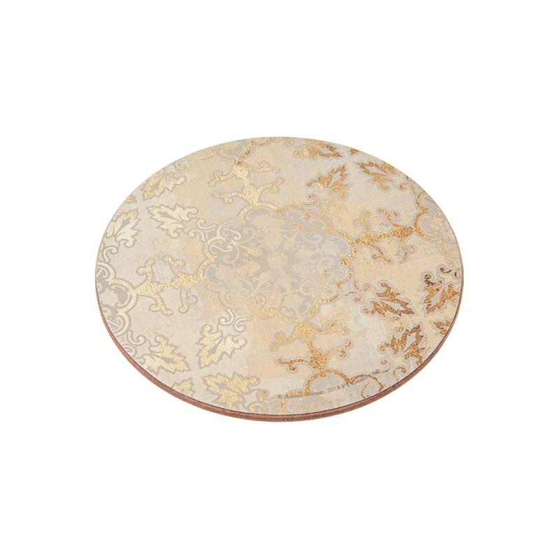 Each coaster features the elegant Gold Impressions design, showcasing delicate filigree floral patterns set against a shimmering gold background. The round shape and sophisticated gold-grey colour palette make them ideal for both modern and classic interiors.
