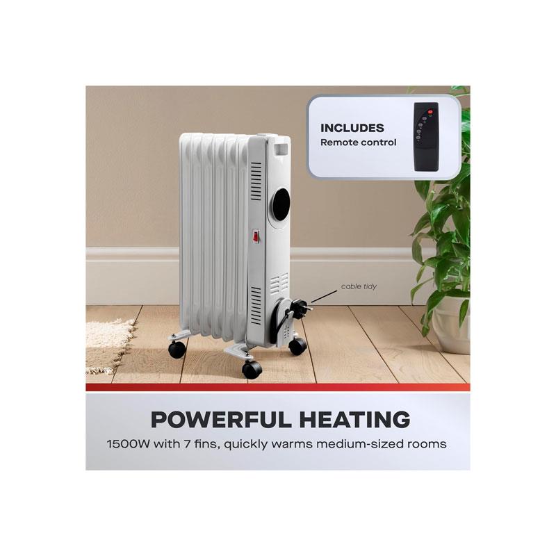 Home / Home & Kitchen / Electrical / Heating / Daewoo Oil Filled Radiator 1500W Adjustable Thermostat Overheat Protection Timer LED Display Cord Storage Remote Control White