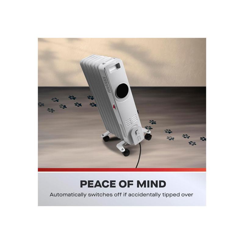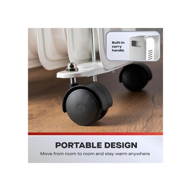 Built with safety in mind, this heater features overheat protection, a tip-over safety switch, and a power indicator light. Smooth castor wheels, a carry handle, and cord storage provide easy mobility and clutter-free use. Finished in a clean white design, it blends effortlessly with modern interiors. Backed by a 3-year warranty (with online registration), this radiator offers dependable, long-lasting warmth for any home.