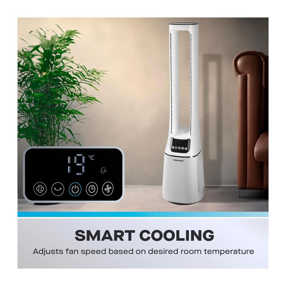 Daewoo 2-In-1 Bladeless Tower Fan With Air Purifier HEPA Filter Quiet Oscillation AI Smart Mode Remote Control 33W - White - Image 3