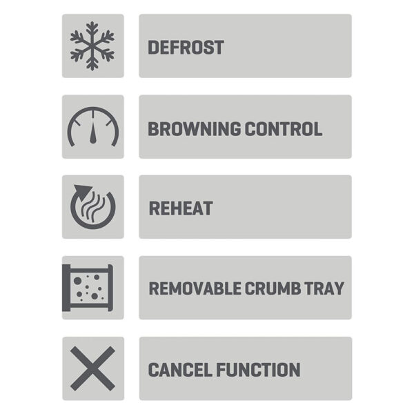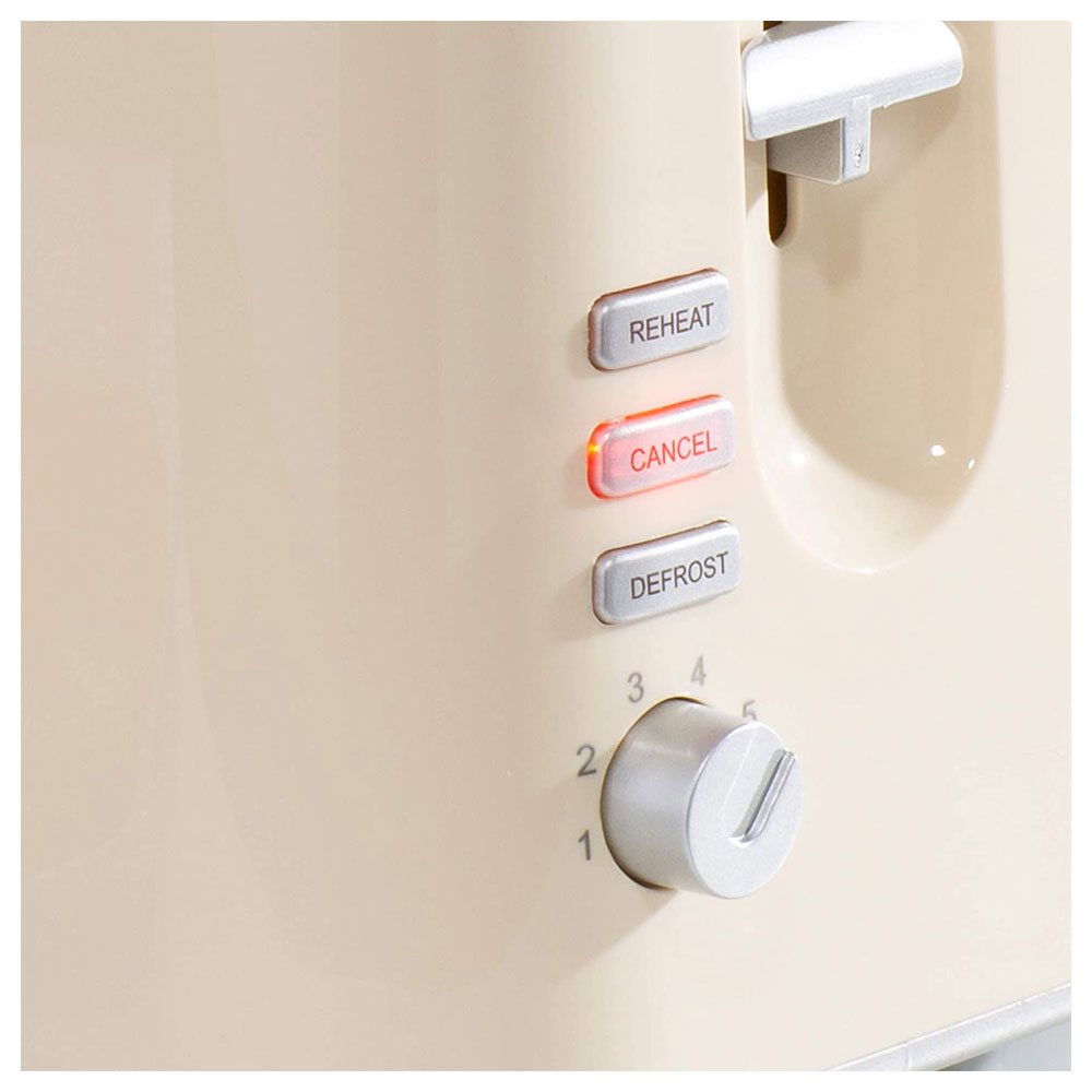 This Cream 2 Slice toaster with full function and browning control is the perfect addition to your kitchen Key features include Full functions include cancel, reheat, and defrost modes Adjustable electronic browning control for perfect toast auto pop-up once your toast is ready to slide-out crumb tray that is easy to remove Plastic outer body that is easy to wipe clean.