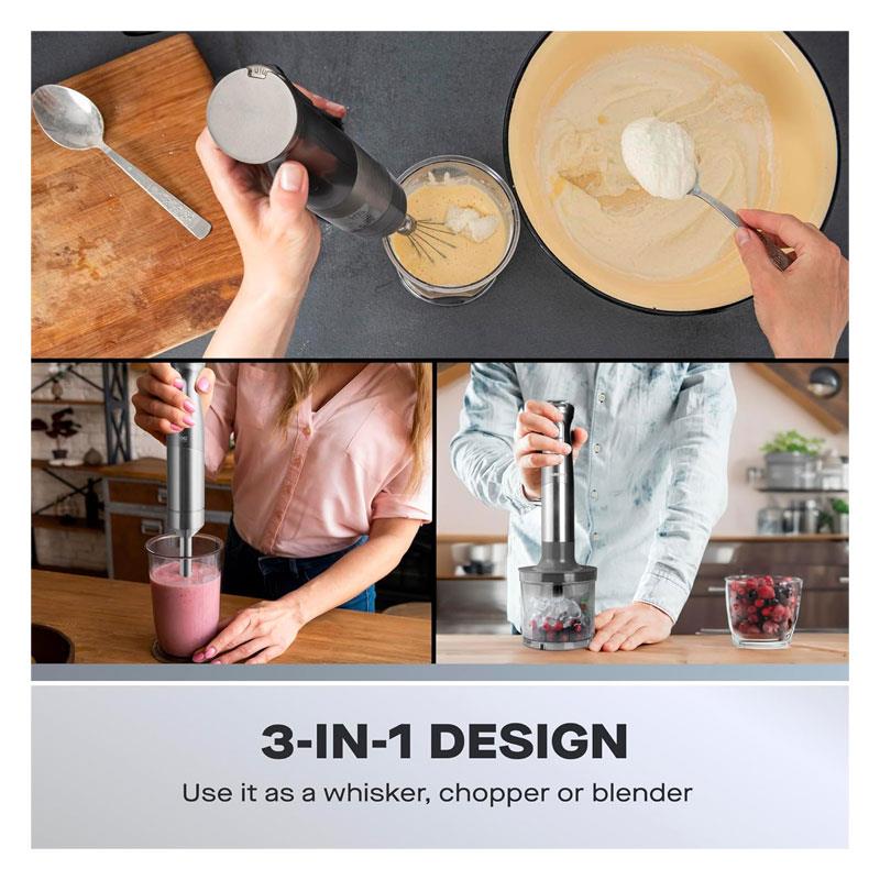 • 3-in-1 Versatility – Switch easily between hand blender, whisk, and 500ml mini chopper for multiple tasks.