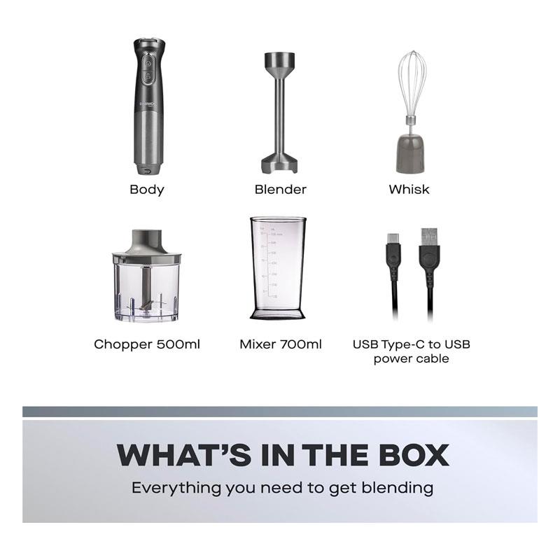 • Attachments: Hand blender, whisk, 500ml mini chopper, USB charging cable, 700ml beaker