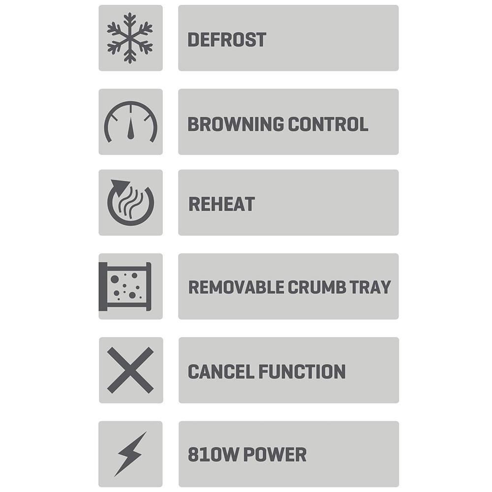 • FUNCTIONS – Make the perfect toast every time with browning controls, toast frozen bread with the defrost function, warm up previously toasted, toast with the reheat function, stop the process anytime by the cancel button and monitor with the LED light
