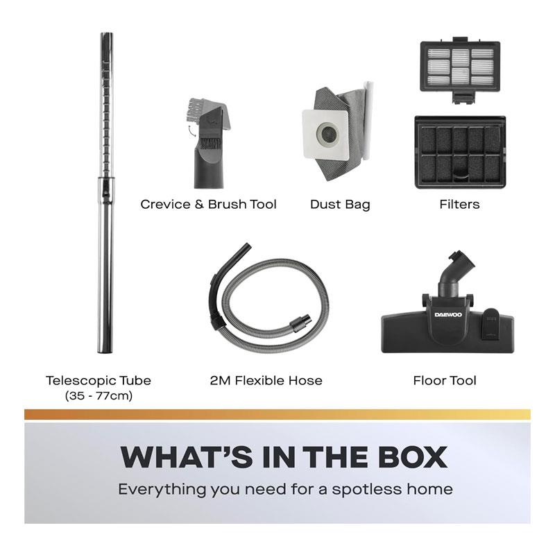 Looking for a lightweight, powerful bagged vacuum cleaner that’s compact yet highly effective? The Daewoo Tornado Compact 700W Vacuum Cleaner is designed for effortless whole-home cleaning. With a portable canister design, 2-litre capacity, and multi-surface tools, this vacuum ensures dust-free carpets, hard floors, stairs, and even your car are spotless in minutes.