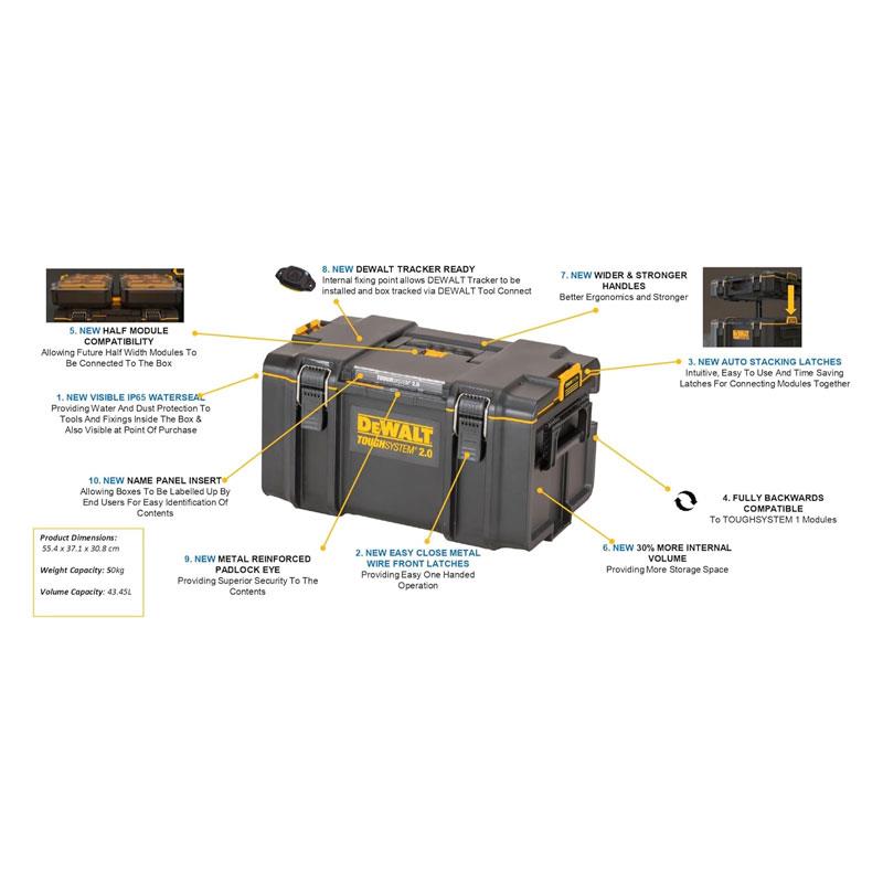 • Modular & Stackable Design – Part of the TOUGHSYSTEM 2.0 range, this tool box easily stacks and locks with other TOUGHSYSTEM units for a fully customisable setup.