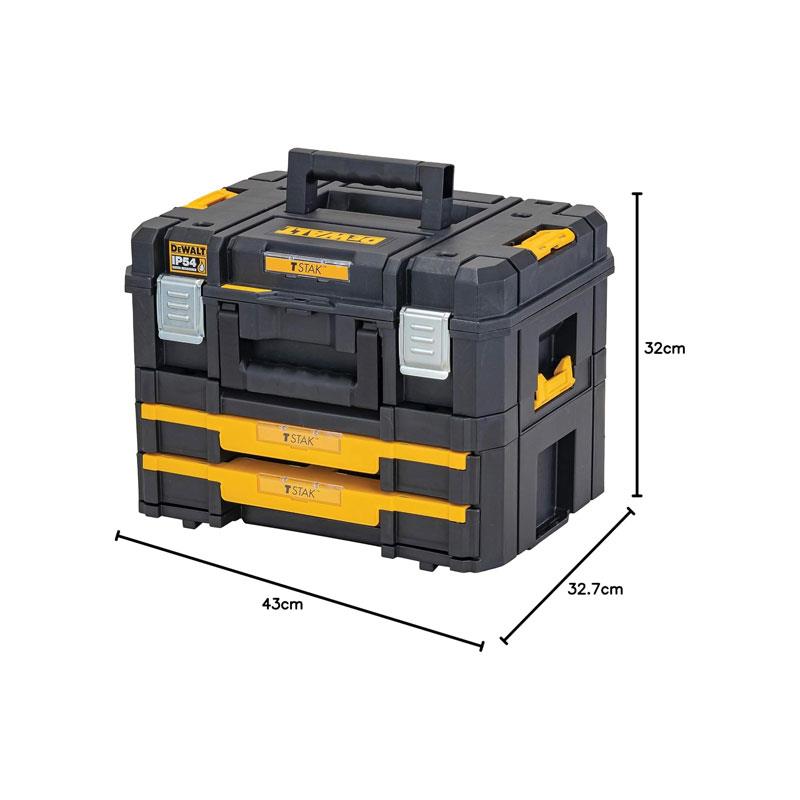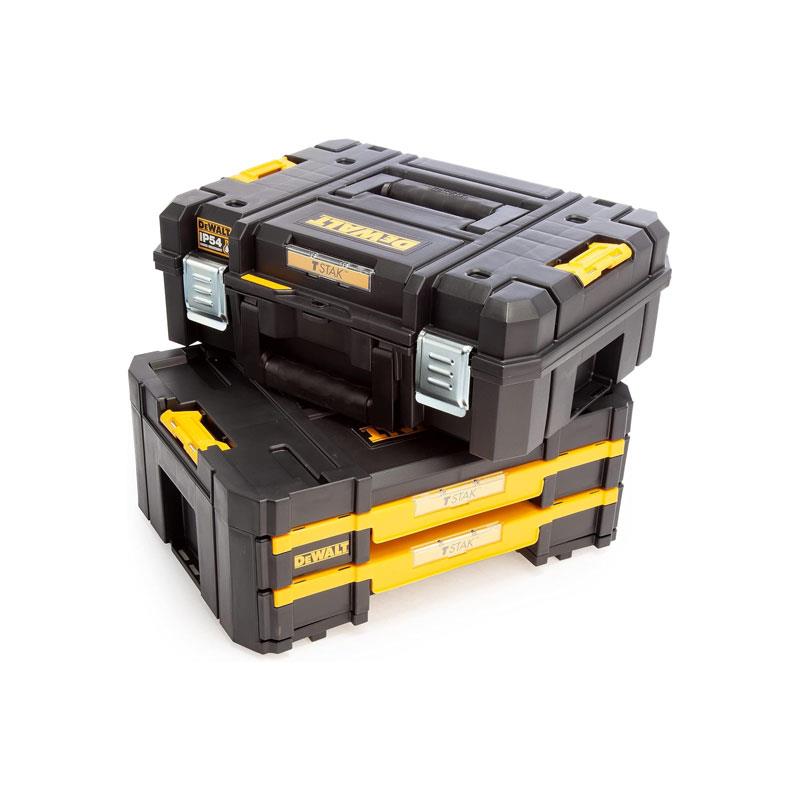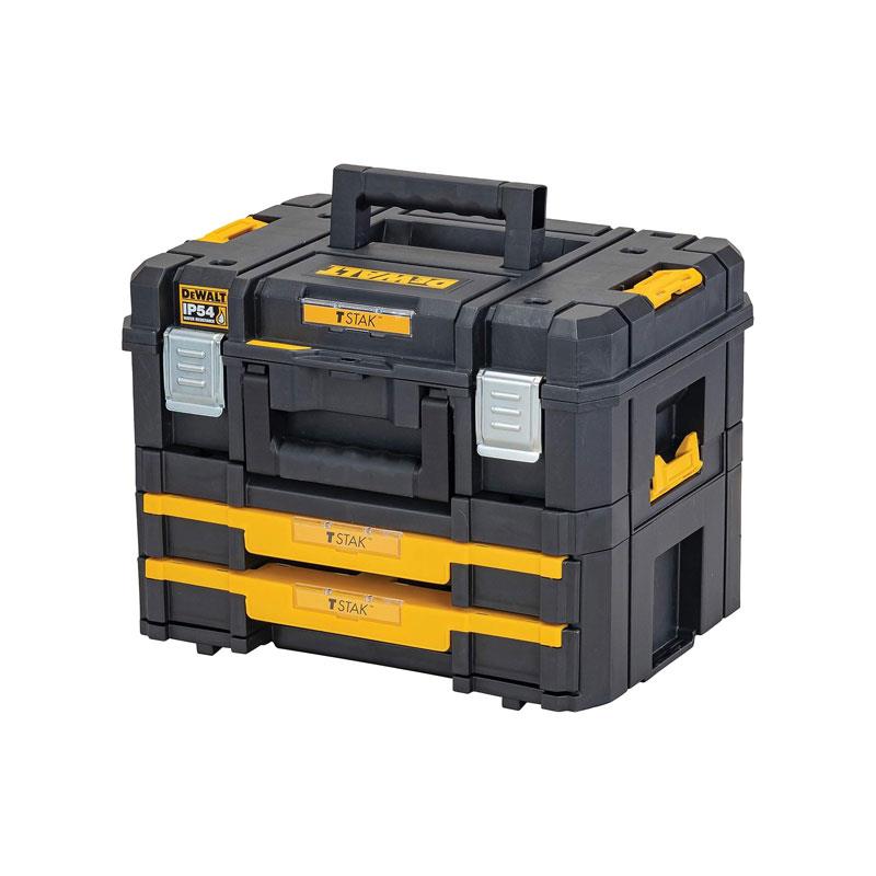 The DEWALT TSTAK IP54 Combo Kit Tool Box is a professional-grade stackable storage solution designed to protect and organise tools on demanding jobsites. Featuring an IP54-rated main compartment, this tool box helps shield equipment from dust and water ingress during transport and storage.
