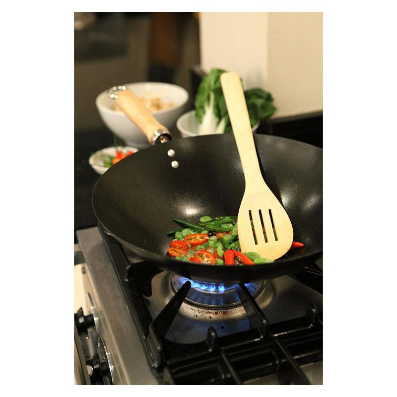 Built from 1.4mm standard gauge carbon steel, it heats rapidly and evenly, allowing you to achieve that delicious wok-seared flavour that makes Asian cooking so special. Finished with a durable non-stick coating, cleaning up is quick and simple, while the ergonomic wooden handle stays cool and provides a comfortable grip throughout cooking.