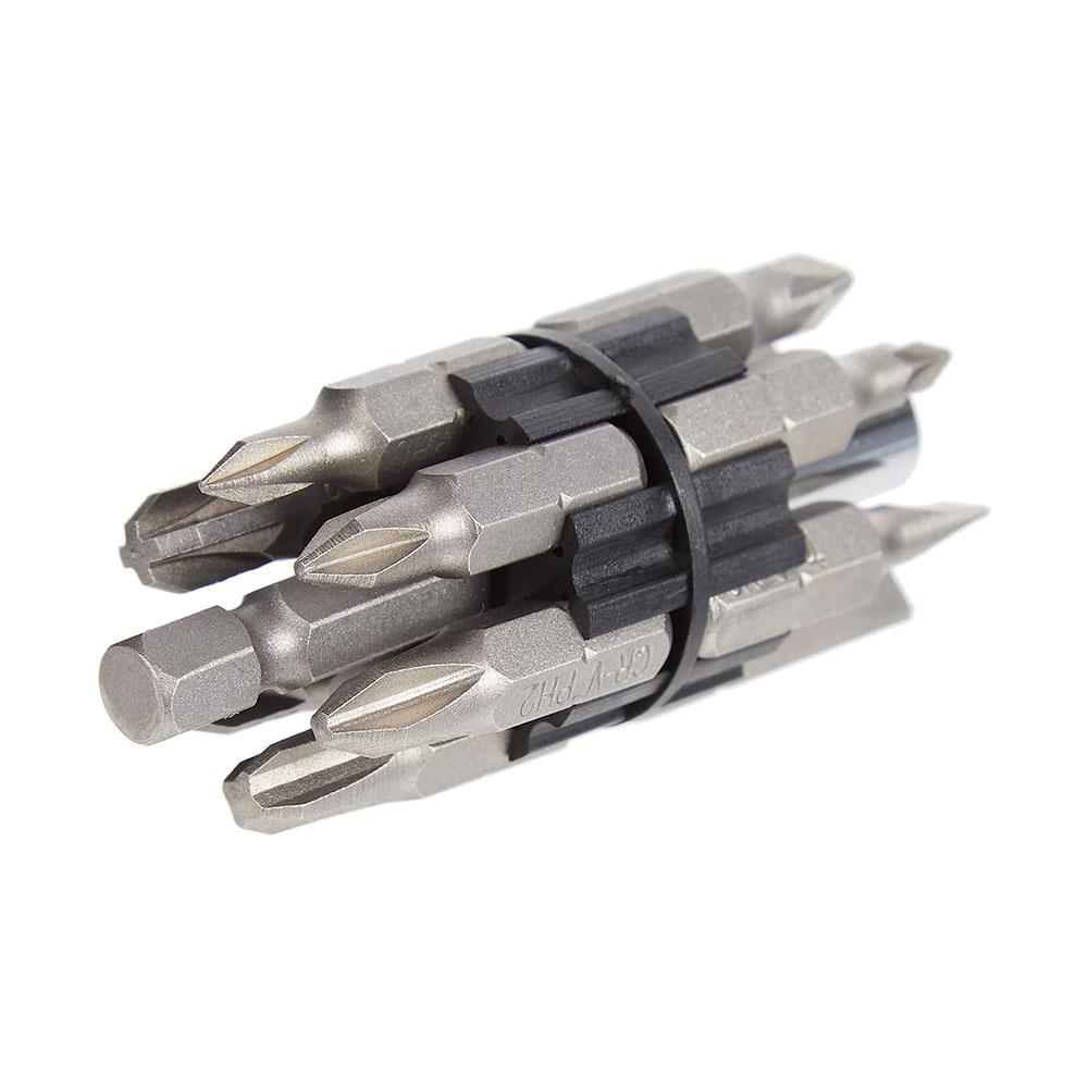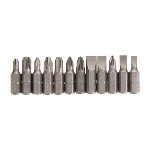 • 12 hardened and tempered chrome vanadium steel slotted, cross-slot, and Pozidriv-type bits