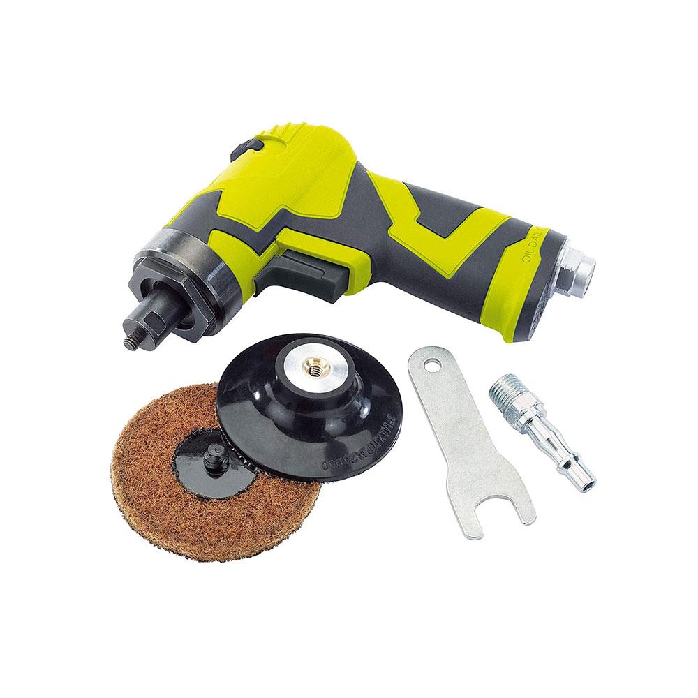 Each air-sander is fitted with a high-speed mechanism that ensures greater stock removal, a rotating air inlet, a quick change threaded packing pad, and a high-tech two-speed motor activated by a trigger for ultimate flexibility.