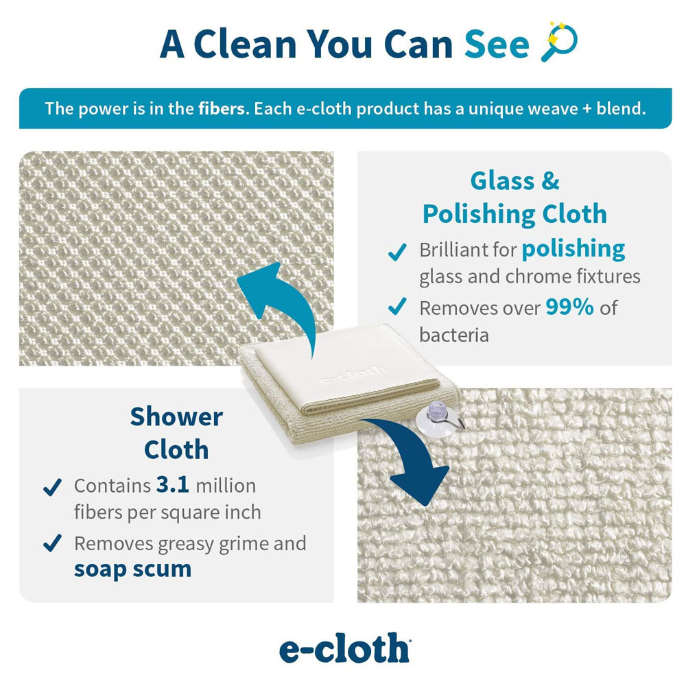• Effective — The E-Cloth Shower Pack holds the one-two punch your cleaning routine is missing. With a specialized microfiber cloth for removing grime, over 99% bacteria, and even limescale, plus another cloth for polishing, all you need is water for spotless, shining ceramic, tile, glass, and chrome