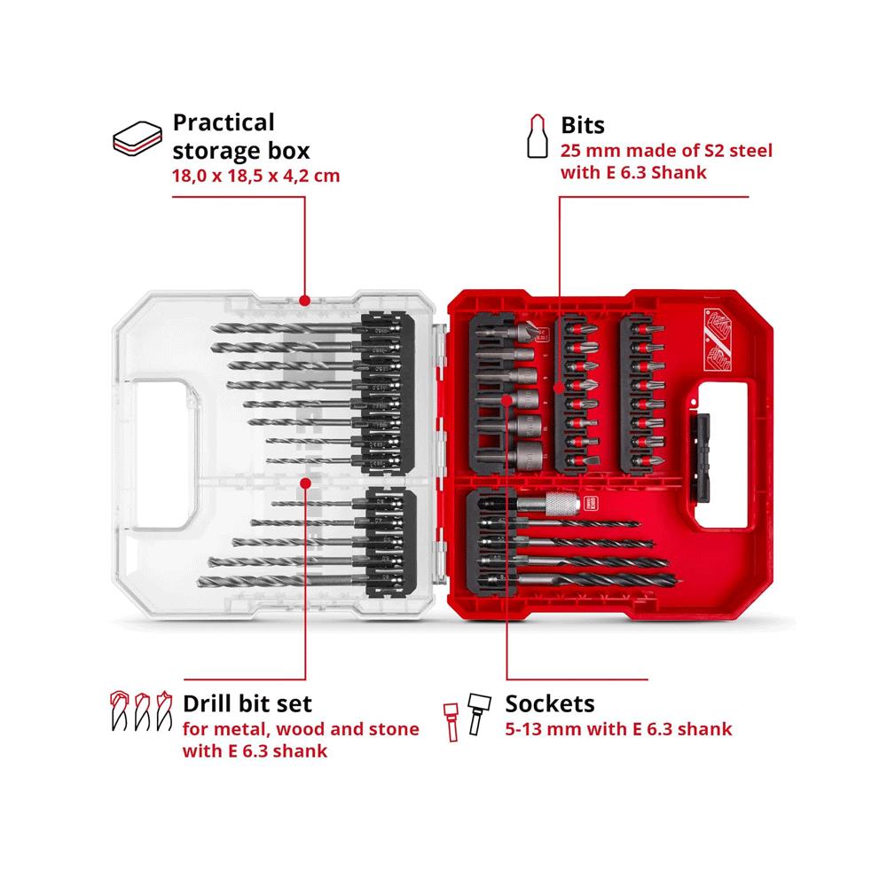 The 40-piece L-CASE from Einhell is suitable for all common drill chucks and bit holders in commercially available cordless screwdrivers and drills. This versatile bit and drill set is designed for a wide range of applications. The bit set contains 16 25 mm bits made of robust, grey sandblasted S2 steel with C 6.3 shank and PH1 / PH2 / PH3 / PZ1 / PZ2 / PZ3 / H3 / H4 / T10 / T15 / T20 / T25 / T27 / T30 / T40 / SL5 drivers. The 60 mm long quick-change bit holder made of carbon steel with E 6.3 shank, metal sleeve and strong magnet ensures quick and easy bit changes. Also included in the Einhell set are five sockets in sizes 5 / 6 / 8 / 10 / 13 mm with 1/4″ drive, made of CV steel. To improve grip and for extra durability, the grey sandblasted sockets have a satin finish with ribbing. The 12 mm countersink with E 6.3 shank is made of grey sandblasted, robust carbon steel. In addition, the L-CASE offers eight metal drill bits made of roll-rolled HSS steel with 135° split-point tip. The four wood drill bits are made of roll-rolled carbon steel and are equipped with a centre point for precise and easy drilling. Five masonry drill bits made of forged carbon steel with inserted carbide plate round off the Einhell tool set and are ideal for working in masonry, stone and concrete. The practical storage box of the bit and drill set in the special Einhell design provides organised storage space for all accessories. While the robust auto-lock clip closure ensures that the box is securely closed, the transparent lid allows an easy overview of the contents. This way, all components are always within reach. With its extensive selection of accessories, the 40-piece Einhell set is the perfect addition to any tool arsenal and enables reliable results in a wide range of applications.