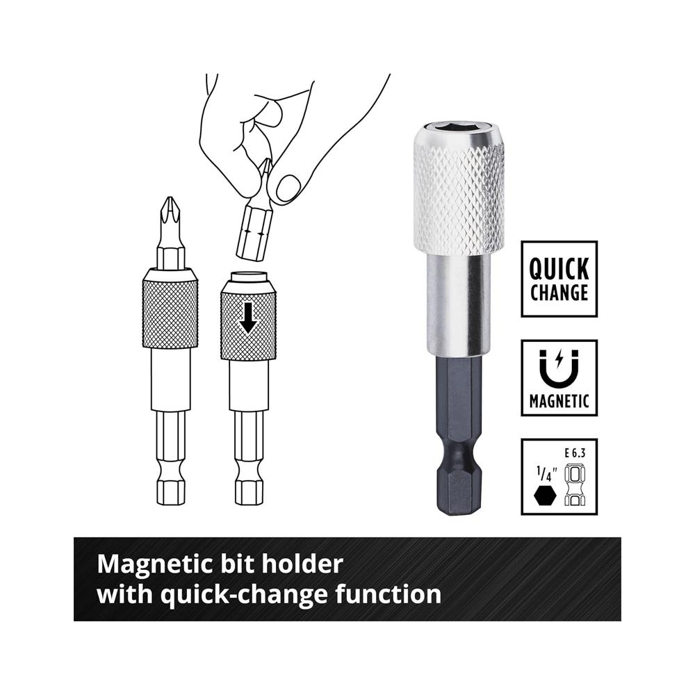 The 60 mm long quick-change bit holder made of carbon steel and a metal sleeve has an E 6.3 shank and a strong magnet. This tool makes it possible to change bits quickly and easily, resulting in more efficient working.
