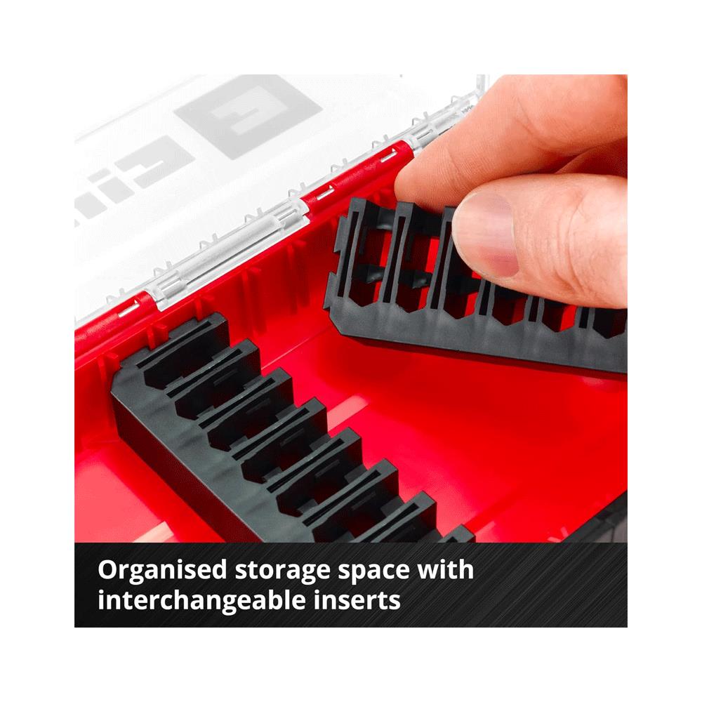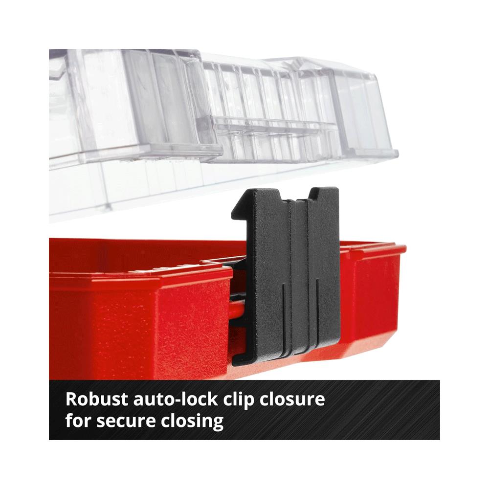 The practical Einhell storage box not only serves as an organised storage space for all included components, but also offers a robust auto-lock clip closure that ensures secure closing. The transparent lid allows you to see the components of the box at a glance. In addition, the various inserts can be exchanged as needed. This way, the right tool is quickly at hand.