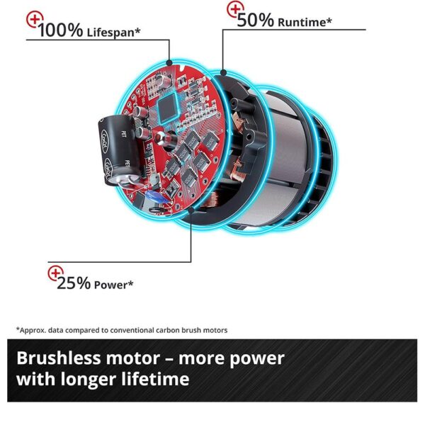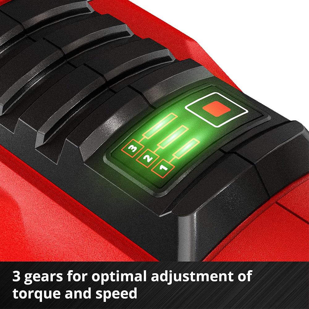 The speed and torque can be adjusted in 3 stages: To allow sensitive working through to providing plenty of power for changing tyres. The durable brushless motor guarantees improved performance and a longer service life