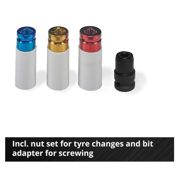 The Impaxxo 18/400 cordless impact wrench makes effortless work of driving in large or long screws, and unlike impact drill drivers it helps reduce strain on the user’s joints. As a member of the Power-X-Change family, all the rechargeable batteries from the high-quality system series can be used in the impact wrench. A cordless impact wrench is suitable for a whole range of jobs in the home, the workshed and especially the garage. The device is powered by the Einhell PurePOWER brushless motor. This brushless motor offers more power and a longer running time than conventional carbon brush motors. After registering online, the brushless motor comes with a 10-year warranty. Its high torque makes it an easy job to release e.g. wheel nuts. Three speed settings are available for optimum adjustment of the speed. This impact wrench comes with a robust 1/2″ external square drive mount, and there is also an LED Light for optimum illumination of the work area. Also included in delivery are a bit adapter for screwdriving and a practical nut set for changing vehicle tires Delivery does not included a battery or charger. These items are available separately, e.g. as a practical starter set in various sizes.