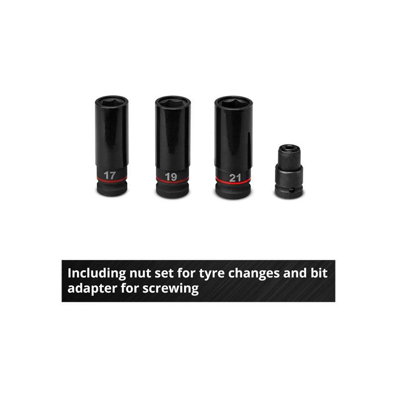 - Versatile Application – Includes 1/2″ external square socket, hex bit adapter, and nut set for tire changes.