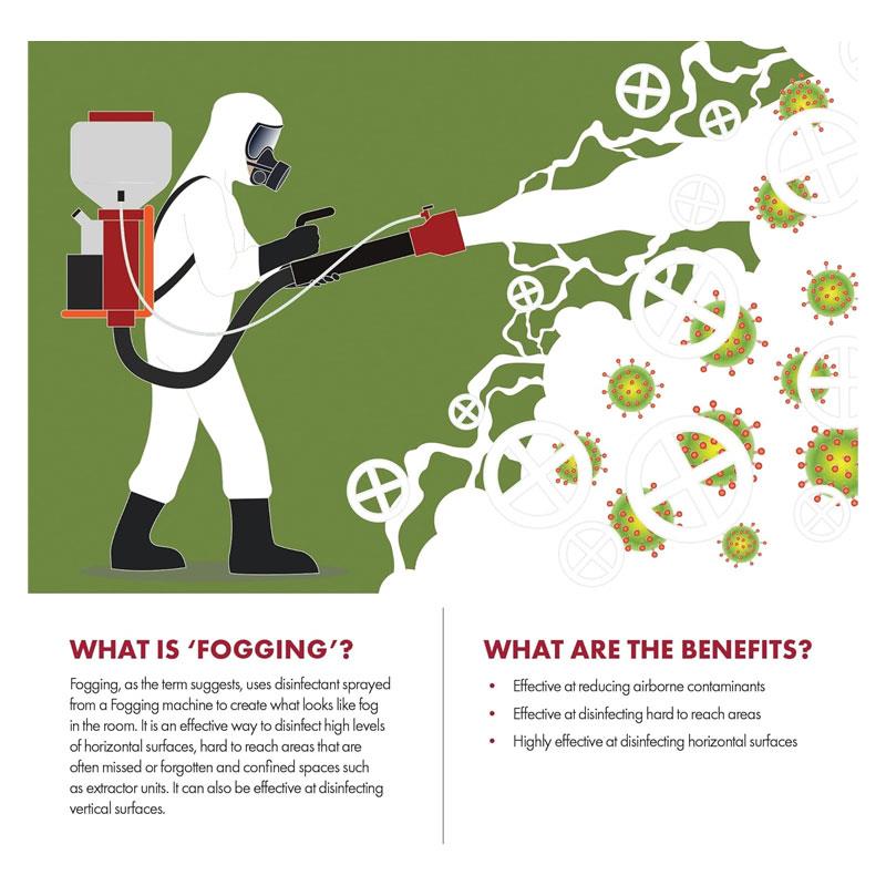 Fogging is the most effective way to ensure 360° surface coverage, reaching every corner and hard-to-access area. It helps reduce viruses, bacteria, and airborne pathogens, ensuring a safer environment.
