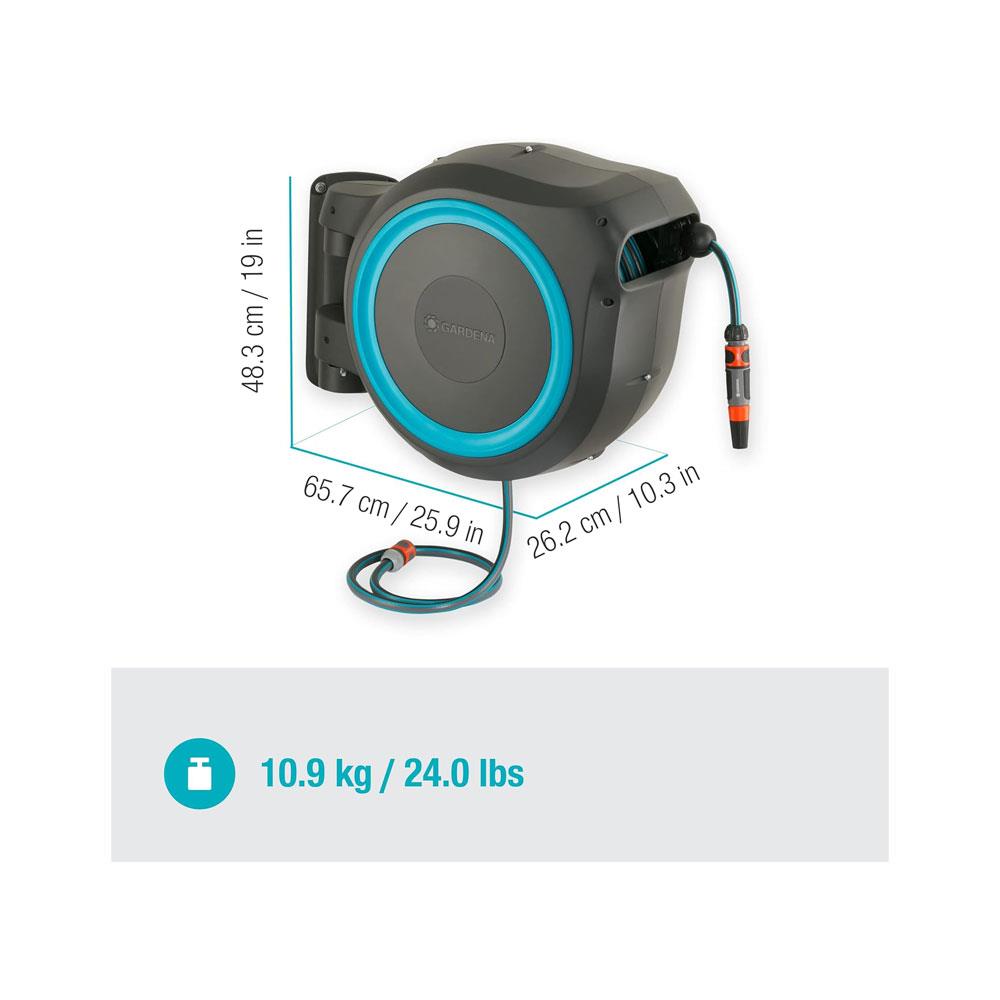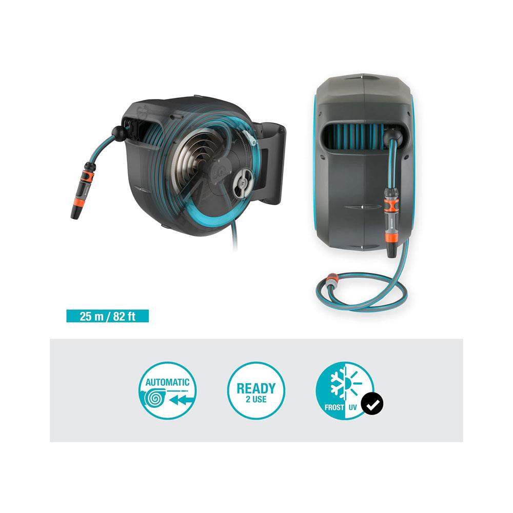 • Complete set: Includes 1x Gardena Wall-Mounted Hose Box RollUp, 25m hose (13 mm), connecting hose, nozzle, and all necessary wall-mounting hardware.