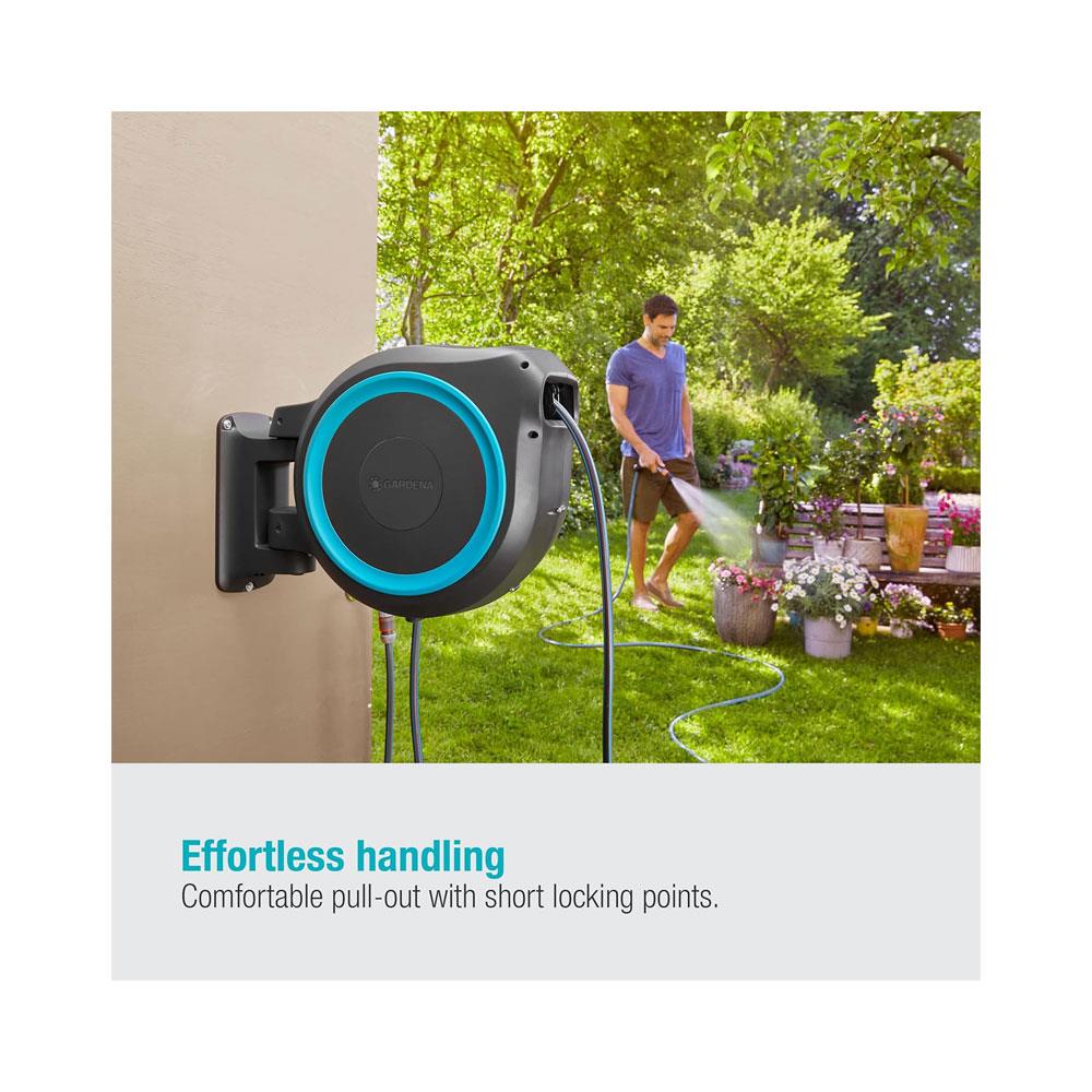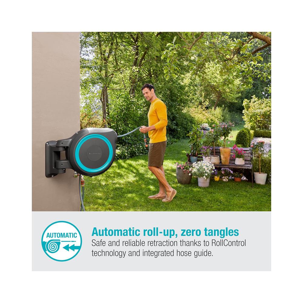 • Effortless operation: Say goodbye to bending down and winding hoses. With Gardena’s RollControl technology, the hose is retracted slowly and steadily with minimal effort.